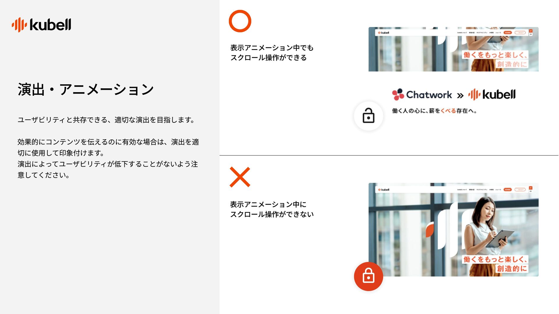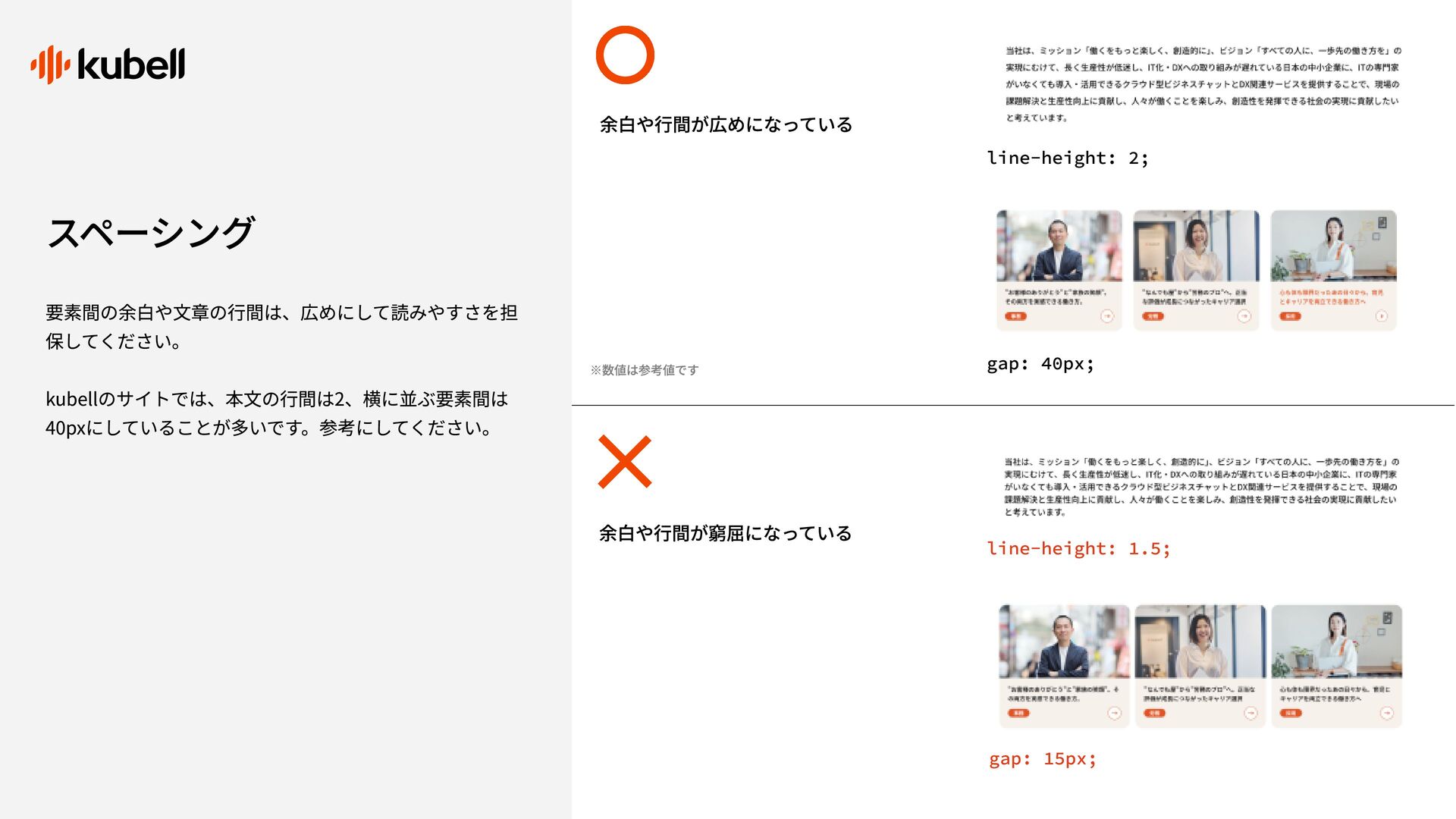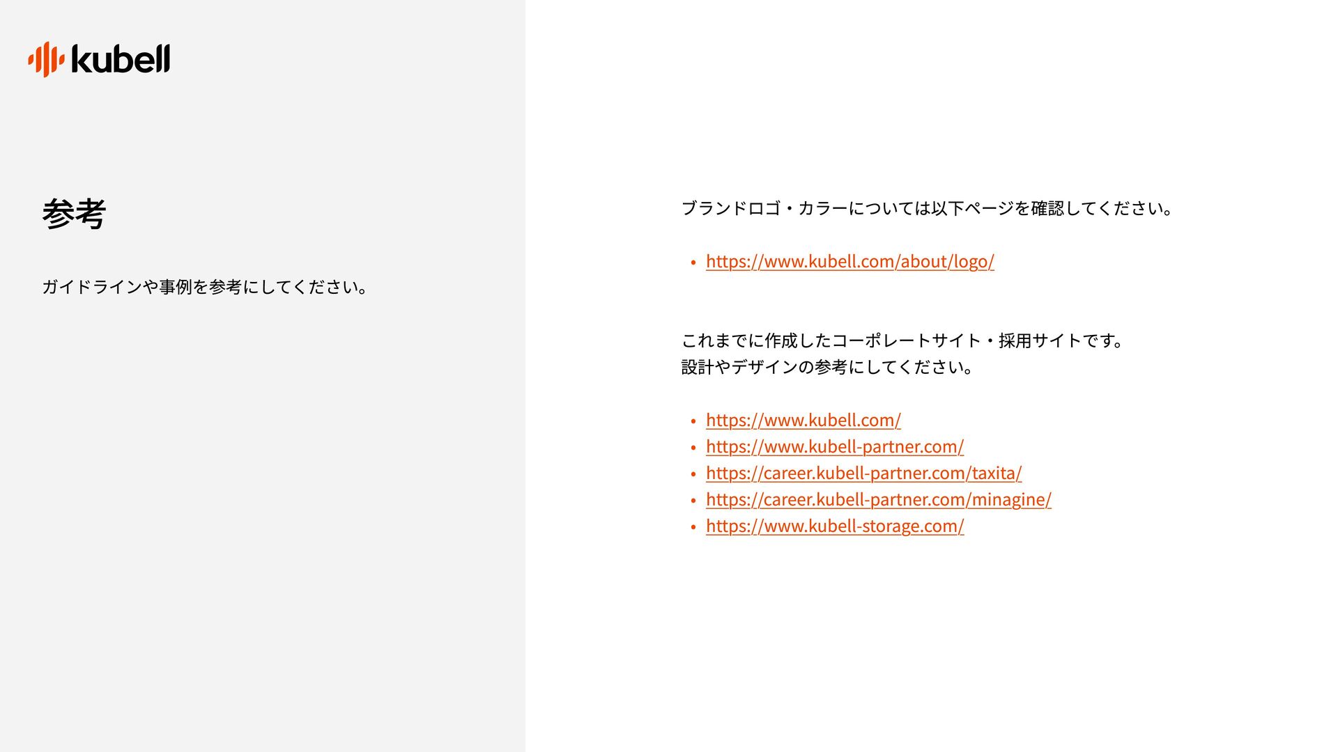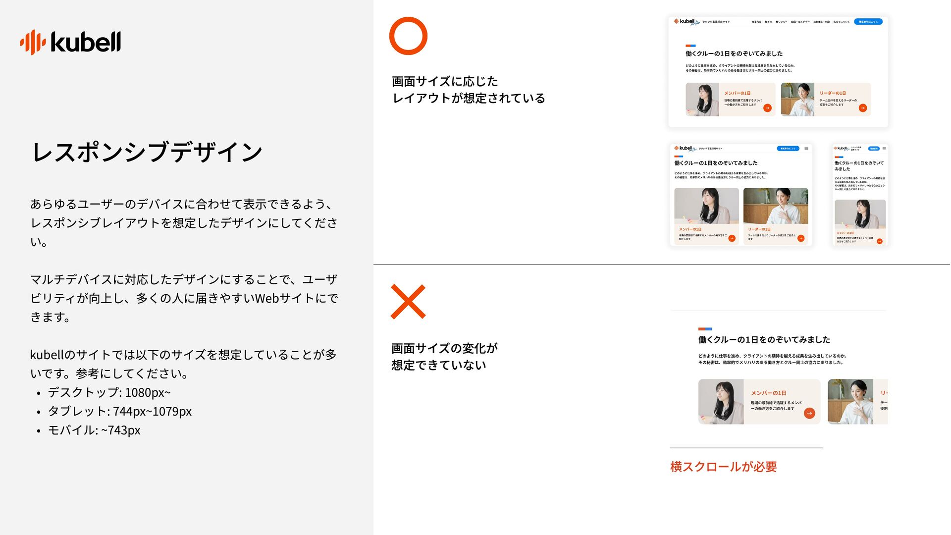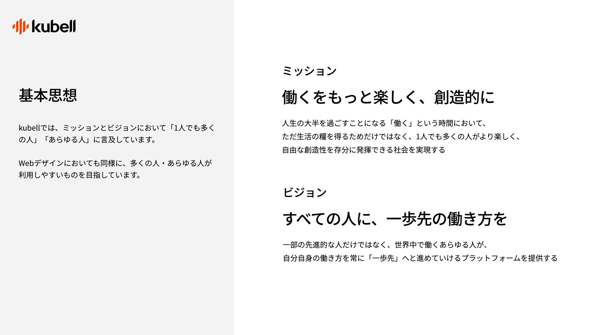 株式会社kubellがWebサイト制作において大切にしているデザイン・実装の指針をまとめたガイドラインです。 ミッション「働くをもっと楽しく、創造的に」に基づき、文字サイズ、余白、レスポンシブ対応など、Webサイトを制作・運用する際の品質基準とルールをとりまとめています。