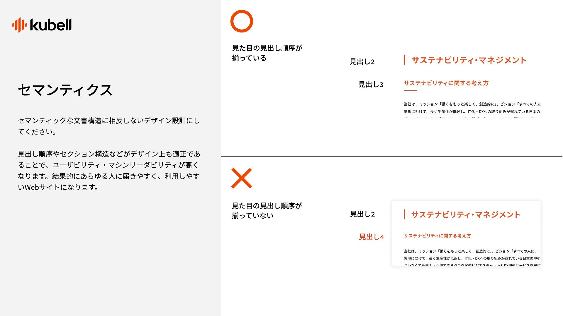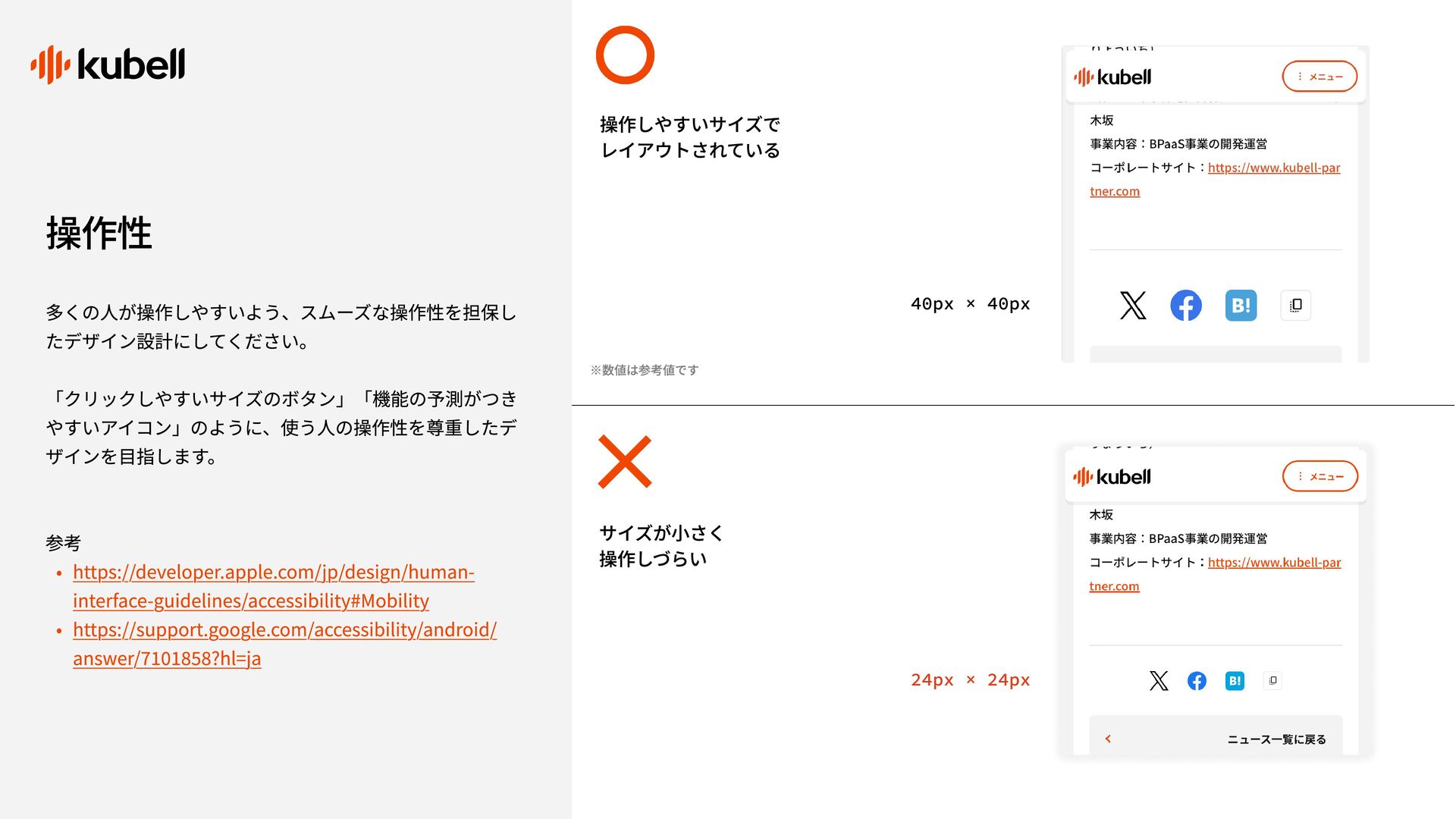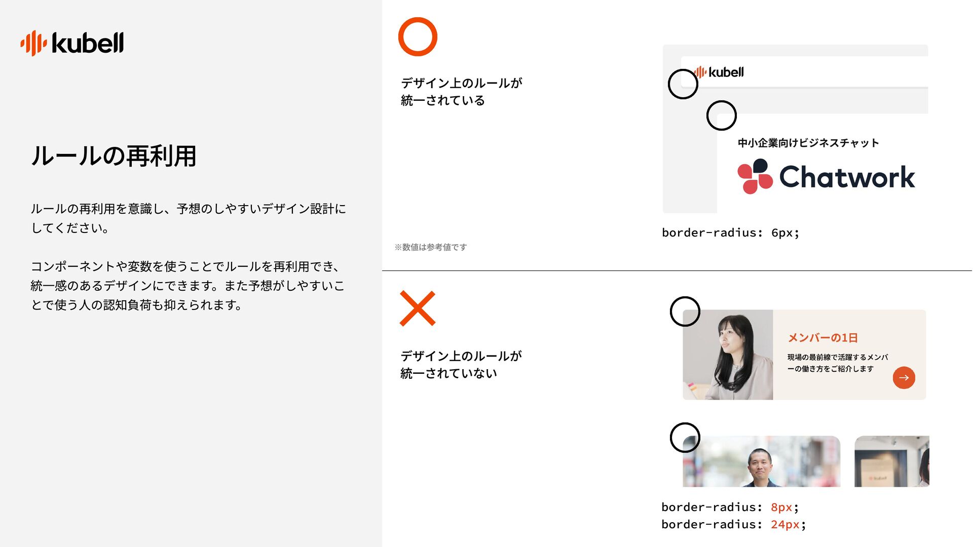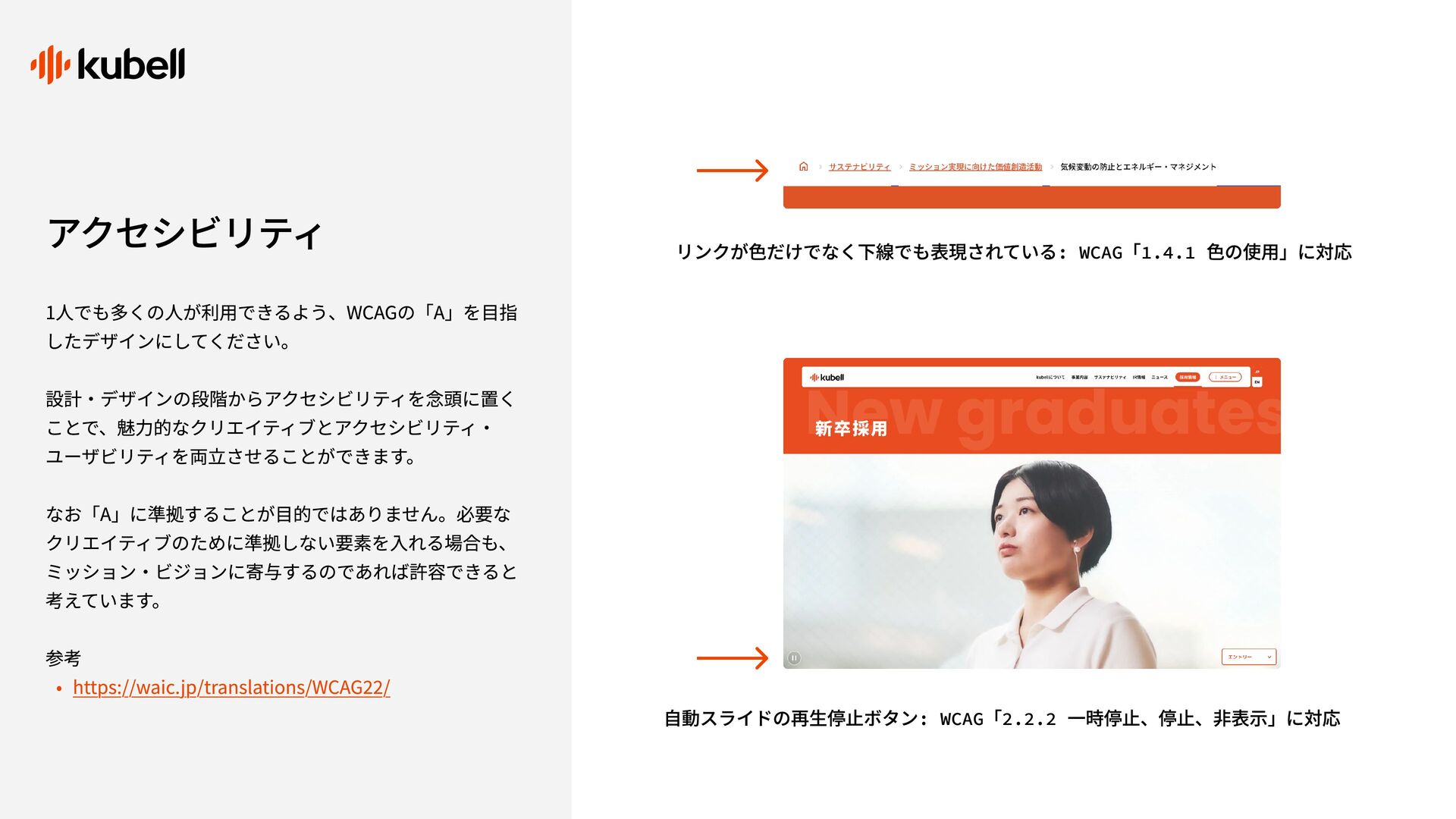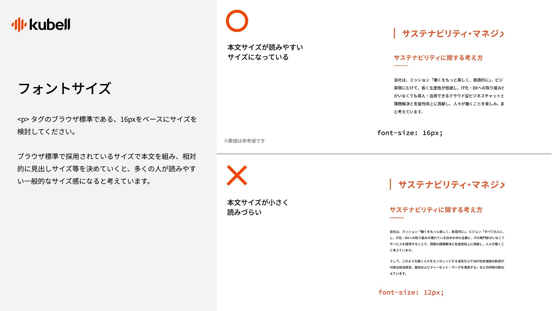 株式会社kubellがWebサイト制作において大切にしているデザイン・実装の指針をまとめたガイドラインです。 ミッション「働くをもっと楽しく、創造的に」に基づき、文字サイズ、余白、レスポンシブ対応など、Webサイトを制作・運用する際の品質基準とルールをとりまとめています。