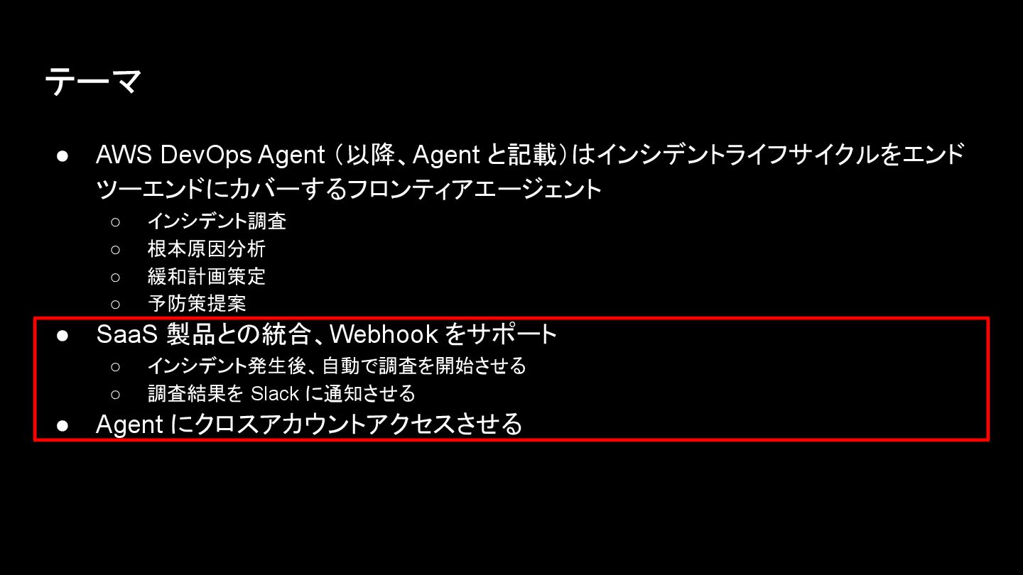 1. テーマ • AWS DevOps Agent (以降、Agent と記載)はインシデントライフサイクルをエンド ツーエンドにカバーするフロンティアエージェント ◦ インシデント調査