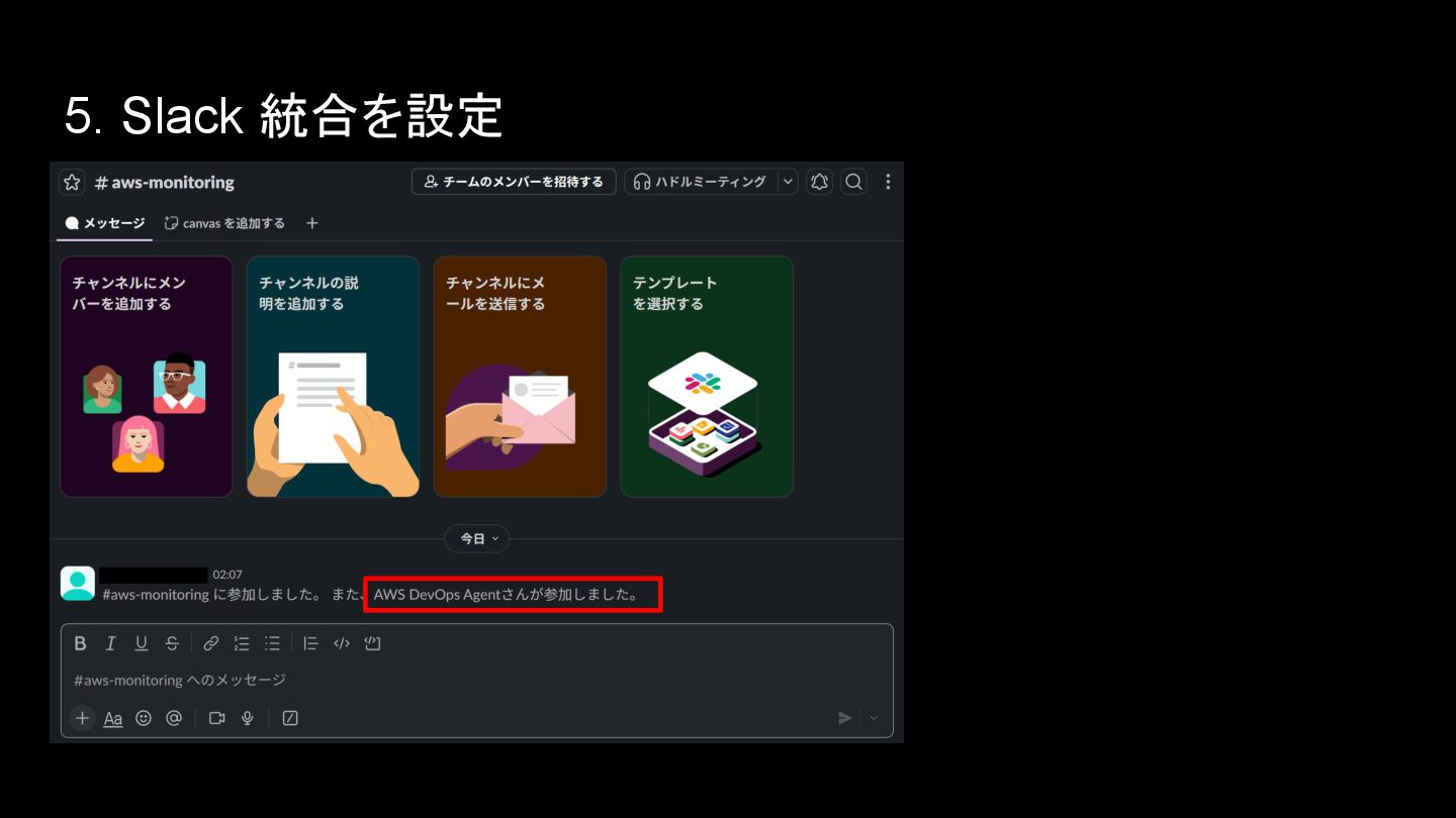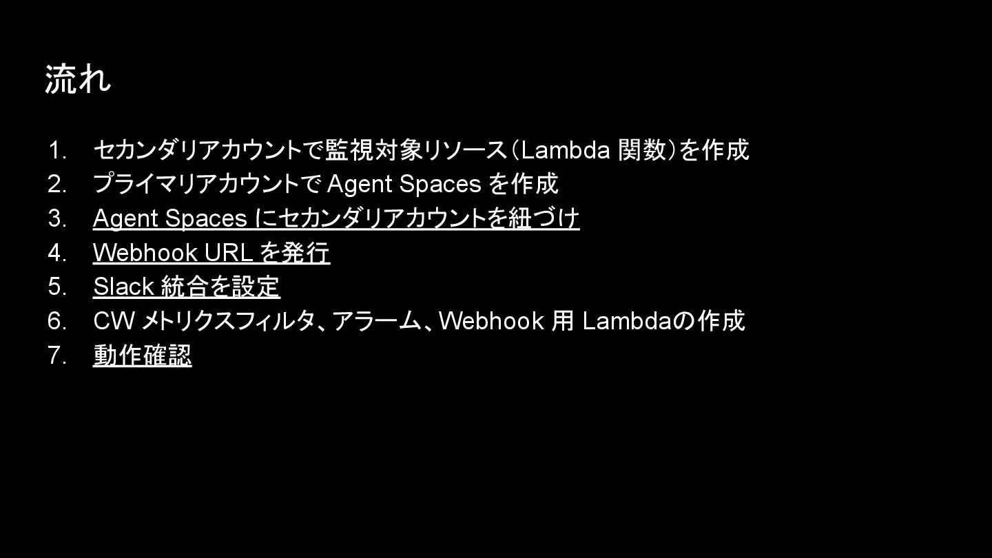 Agent Spaces にセカンダリアカウントを紐づけ 4. Webhook URL を発行 5. Slack 統合を設定 6. CW メトリクスフィルタ、アラーム、Webhook 用 Lambdaの作成 7. 動作確認