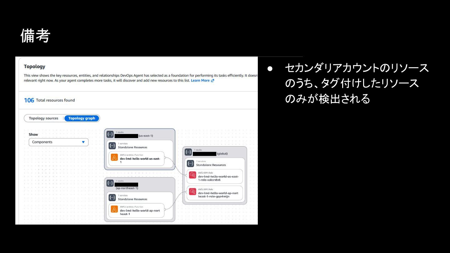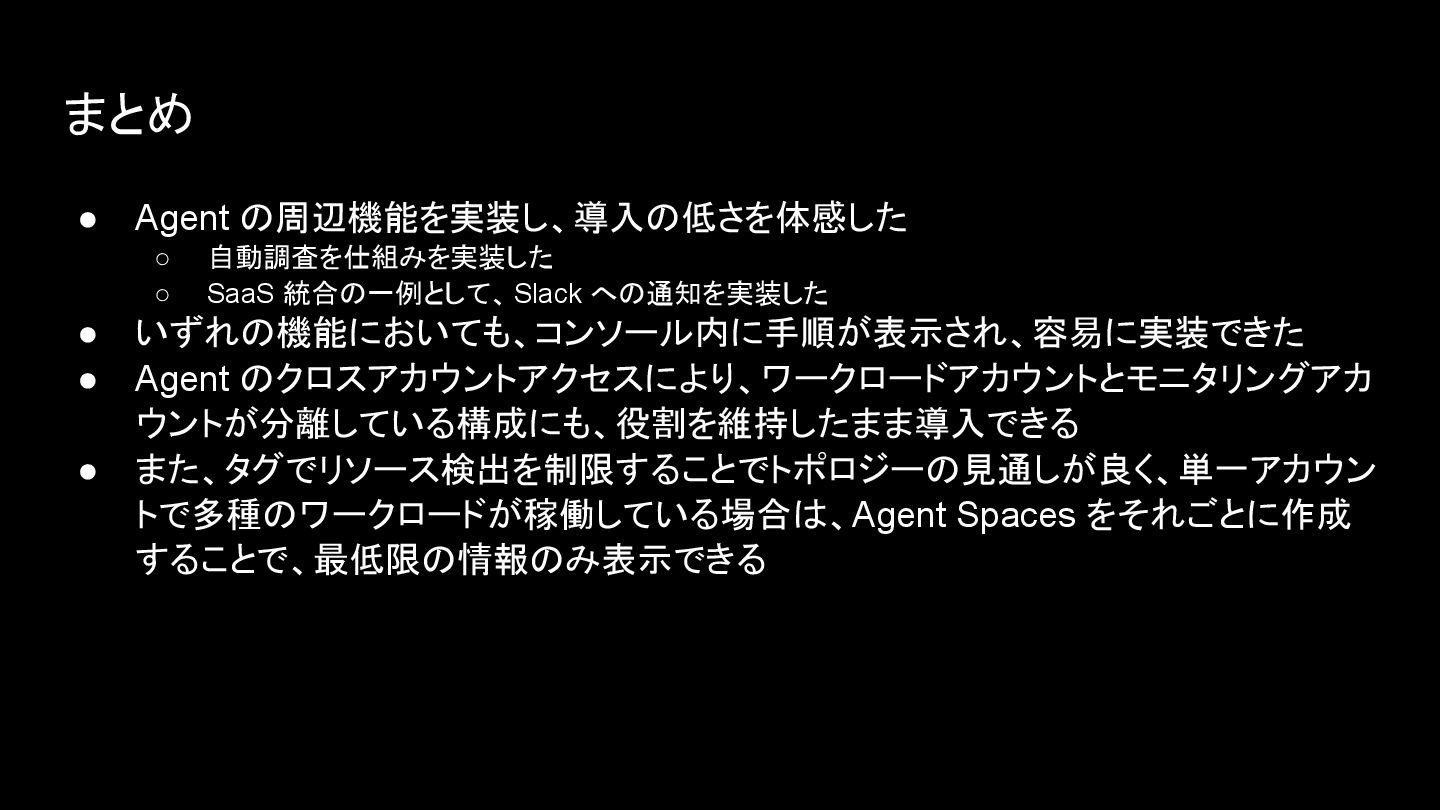 • いずれの機能においても、コンソール内に手順が表示され、容易に実装できた • Agent のクロスアカウントアクセスにより、ワークロードアカウントとモニタリングアカ ウントが分離している構成にも、役割を維持したまま導入できる • また、タグでリソース検出を制限することでトポロジーの見通しが良く、単一アカウン トで多種のワークロードが稼働している場合は、Agent Spaces をそれごとに作成 することで、最低限の情報のみ表示できる