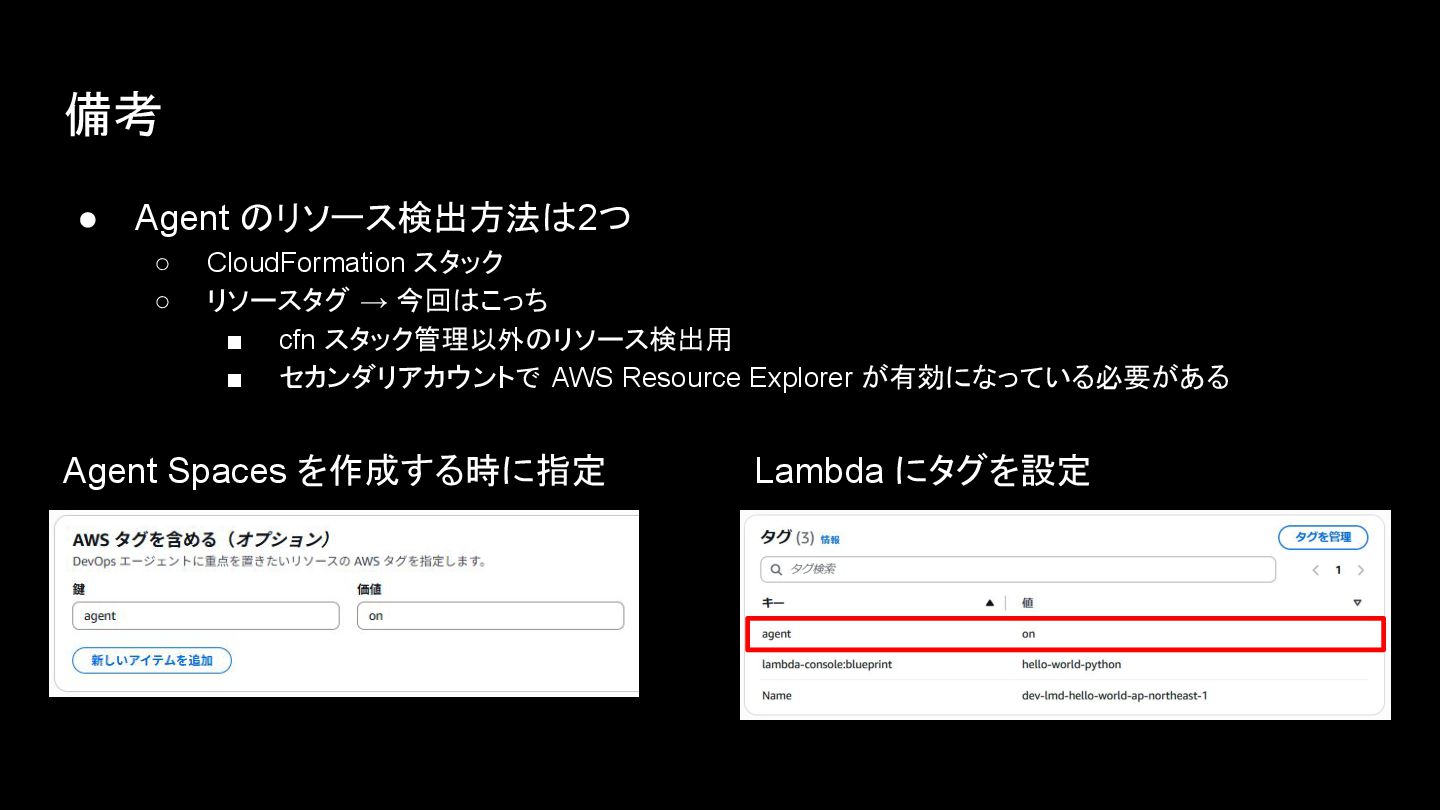 ▪ cfn スタック管理以外のリソース検出用 ▪ セカンダリアカウントで AWS Resource Explorer が有効になっている必要がある 備考 Agent Spaces を作成する時に指定 Lambda にタグを設定