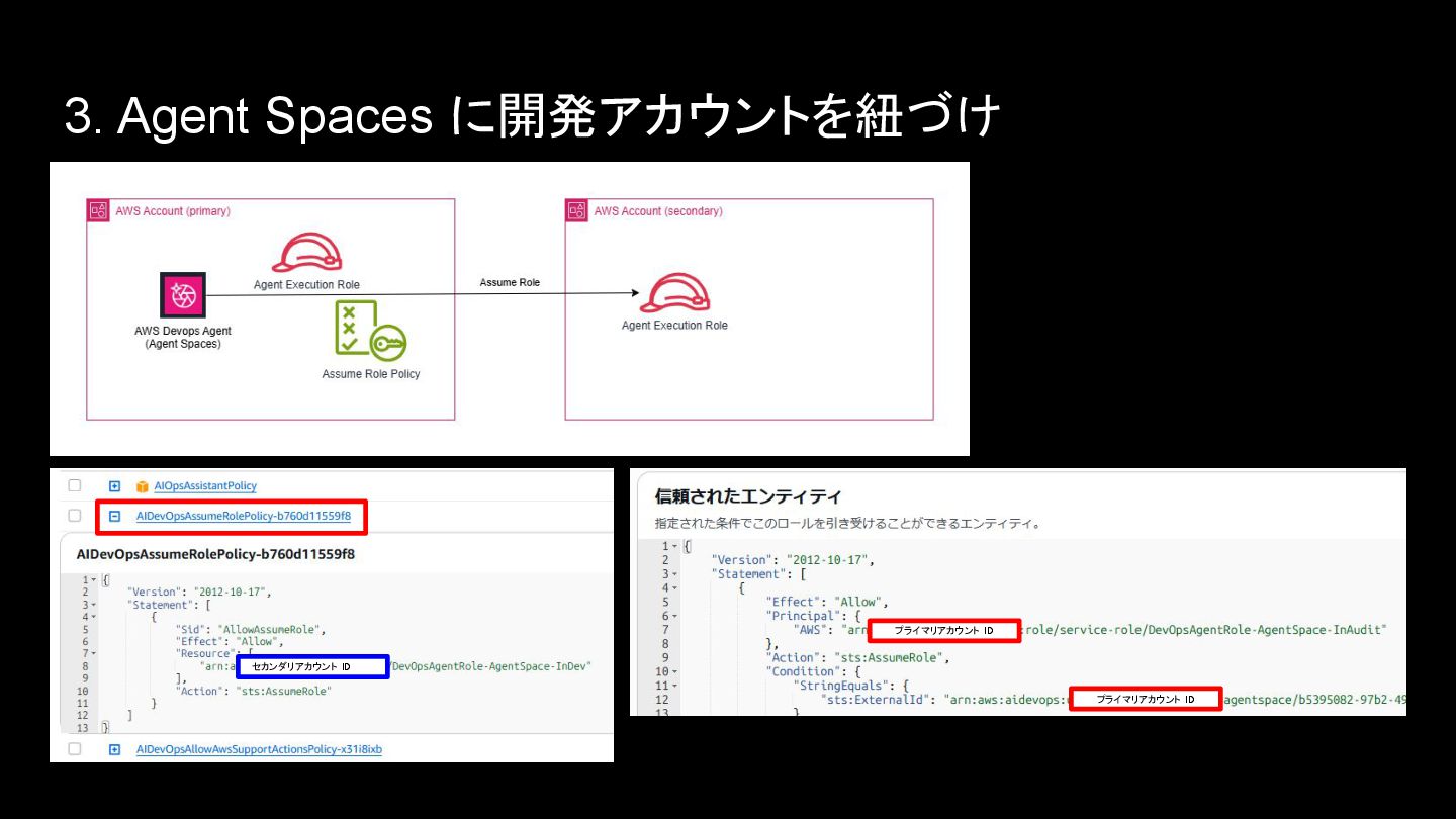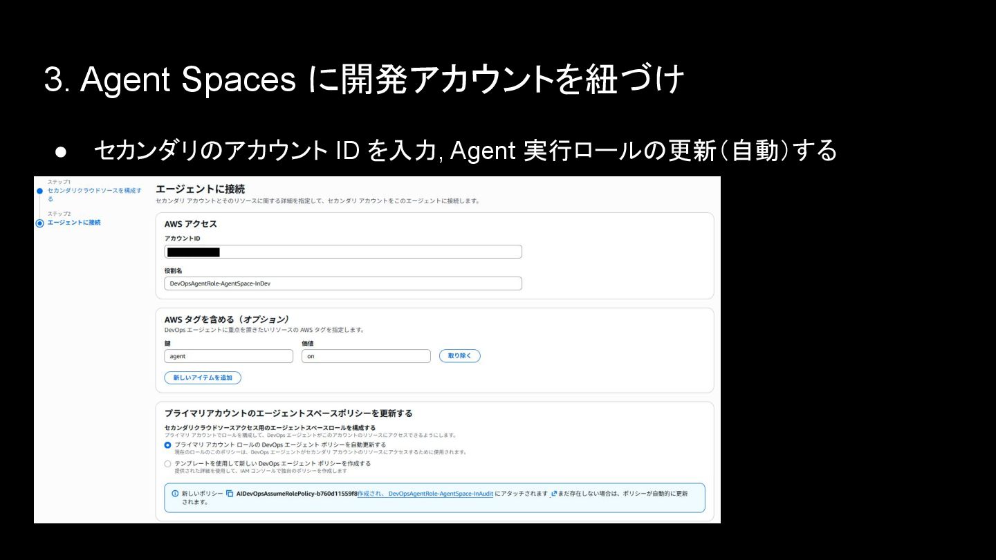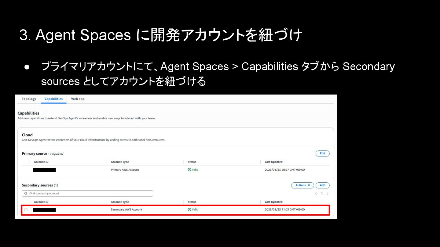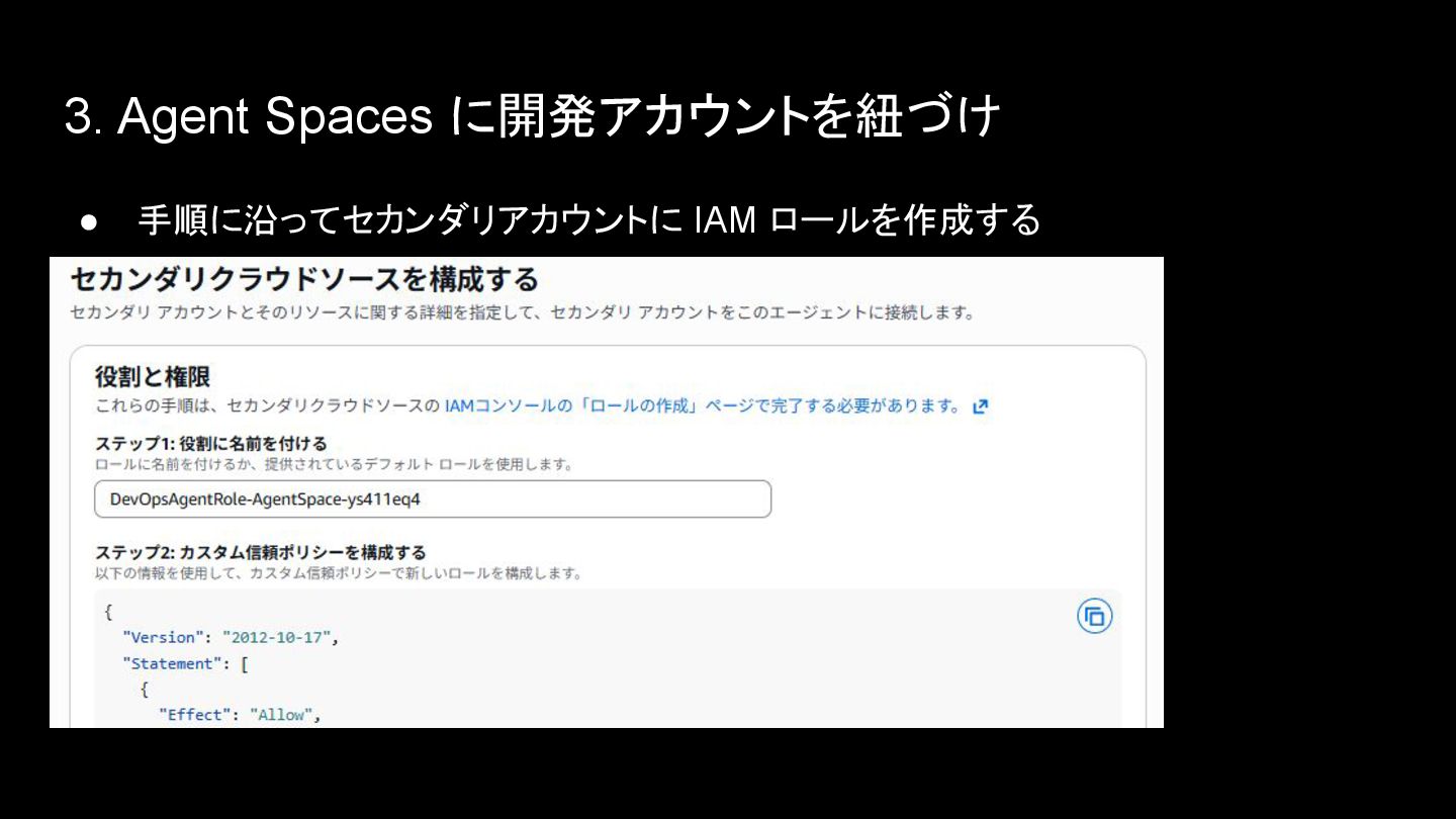3. 流れ 1. セカンダリアカウントで監視対象リソース(Lambda 関数)を作成 2. プライマリアカウントで Agent Spaces を作成 3.