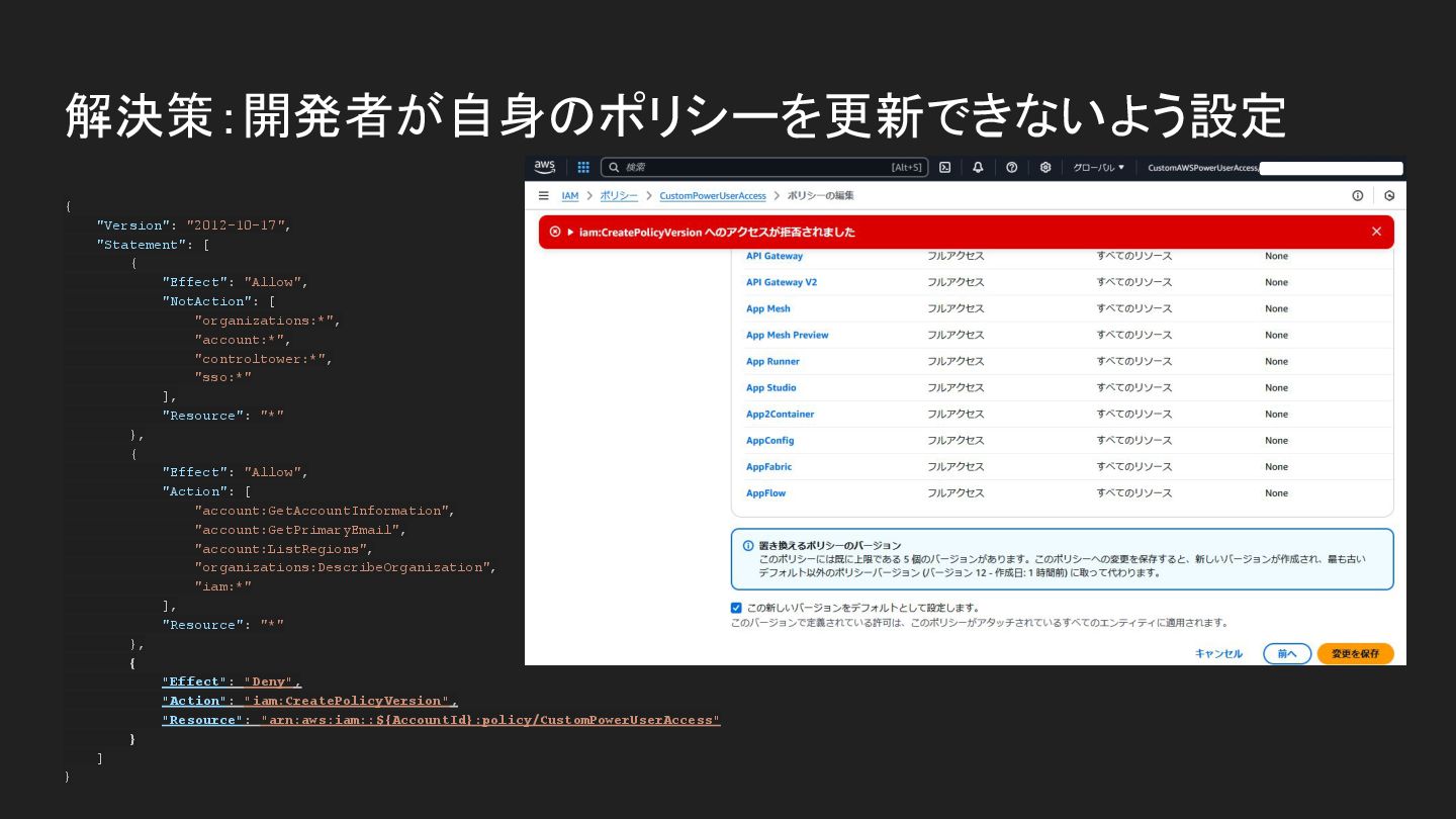 [ "organizations:*", "account:*", "controltower:*", "sso:*" ], "Resource": "*" }, { "Effect": "Allow", "Action": [ "account:GetAccountInformation", "account:GetPrimaryEmail", "account:ListRegions", "organizations:DescribeOrganization", "iam:*" ], "Resource": "*" }, { "Effect": "Deny", "Action": "iam:CreatePolicyVersion", "Resource": "arn:aws:iam::${AccountId}:policy/CustomPowerUserAccess" } ] }