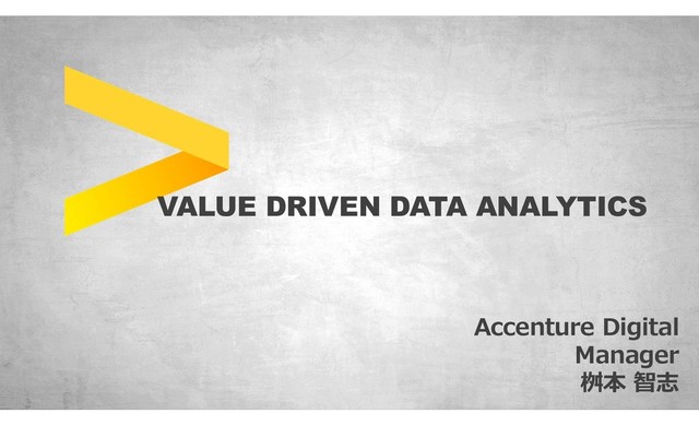 Accenture Confidential Information. Digital-Delivery AAI Part of Accenture Digital 桝本 智志 マネージャー 山口県岩国市出身。FY13にアクセンチュア入社。 BI/DWH構築関連の複数案件を経て、現在は株式会社ARISE analyticsに て通信・広告・小売(EC)・証券など複数社を相手にアナリティクスコンサルティン グ案件を展開中。 主な実績 • BI/DWH/SFA構築 ‐外資系製薬会社 • BI構築‐大手小売業 • サイト内レコメンドエンジン構築‐通信キャリア系小売業 • クラウド・OSSを活用した分析プラットフォーム構築‐大手広告業 • 分析を活用したEコマース改善戦略の立案‐大手小売業 • データ分析を活用した業務改善‐大手通信業