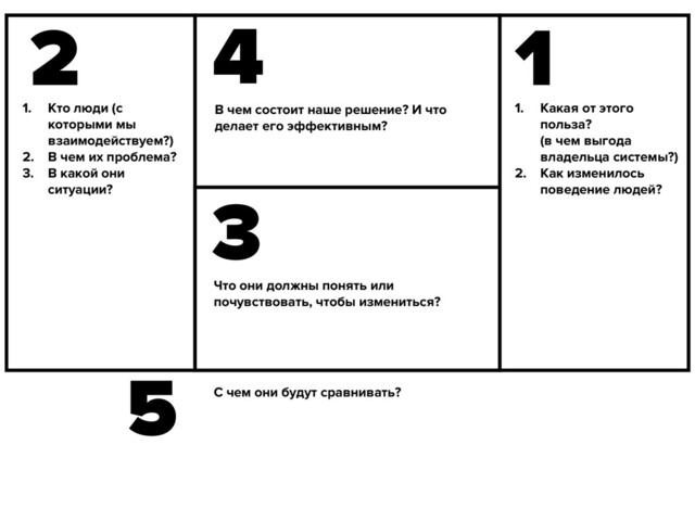 системы?) 2. Как изменилось поведение людей? 1. Кто люди (с которыми мы взаимодействуем?) 2. В чем их проблема? 3. В какой они ситуации? Что они должны понять или почувствовать, чтобы измениться? 1 2 3 В чем состоит наше решение? И что делает его эффективным? 4 5 С чем они будут сравнивать?