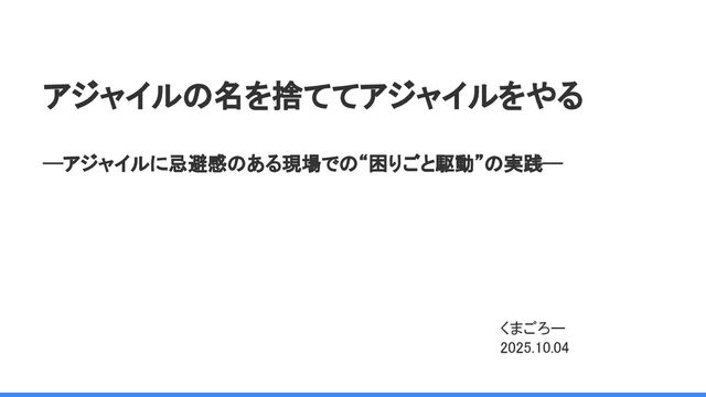 アジャイルの名を捨ててアジャイルをやる ─アジャイルに忌避感のある現場での“困りごと駆動”の実践─ くまごろー 2025.10.04