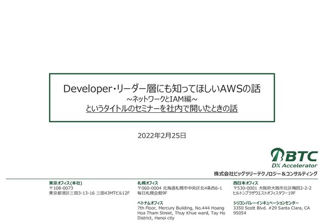 Hoang Hoa Tham Street, Thuy Khue ward, Tay Ho District, Hanoi city 西日本オフィス 〒530-0001 大阪府大阪市北区梅田2-2-2 ヒルトンプラザウエストオフィスタワー19F シリコンバレーインキュベーションセンター 3350 Scott Blvd. #29 Santa Clara, CA 95054 東京オフィス(本社) 〒108-0073 東京都港区三田3-13-16 三田43MTビル12F 株式会社ビッグツリーテクノロジー&コンサルティング Developer・リーダー層にも知ってほしいAWSの話 ~ネットワークとIAM編~ というタイトルのセミナーを社内で開いたときの話 2022年2月25日