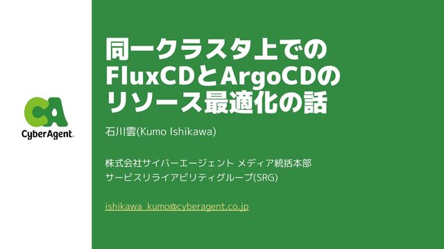 同一クラスタ上での FluxCDとArgoCDの リソース最適化の話 石川雲(Kumo Ishikawa) 株式会社サイバーエージェント メディア統括本部 サービスリライアビリティグループ(SRG)