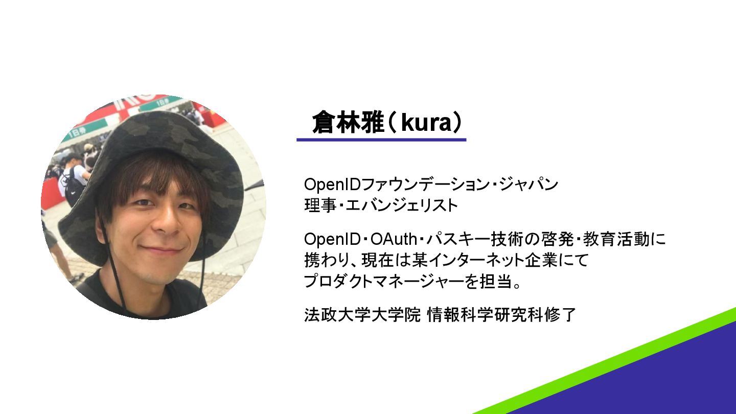 倉林雅(kura) OpenIDファウンデーション・ジャパン 理事・エバンジェリスト OpenID・OAuth・パスキー技術の啓発・教育活動に 携わり、現在は某インターネット企業にて プロダクトマネージャーを担当。 法政大学大学院 情報科学研究科修了