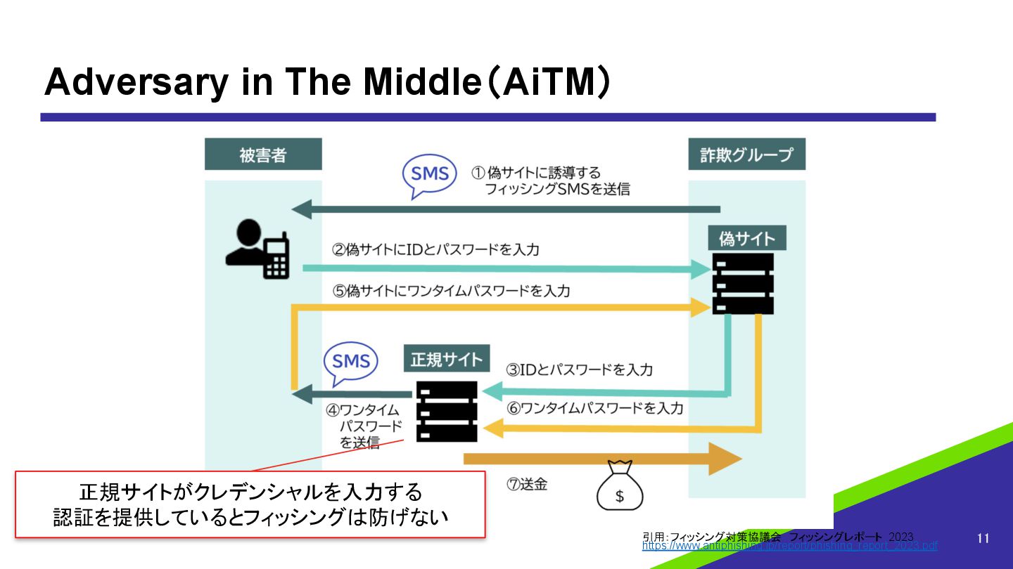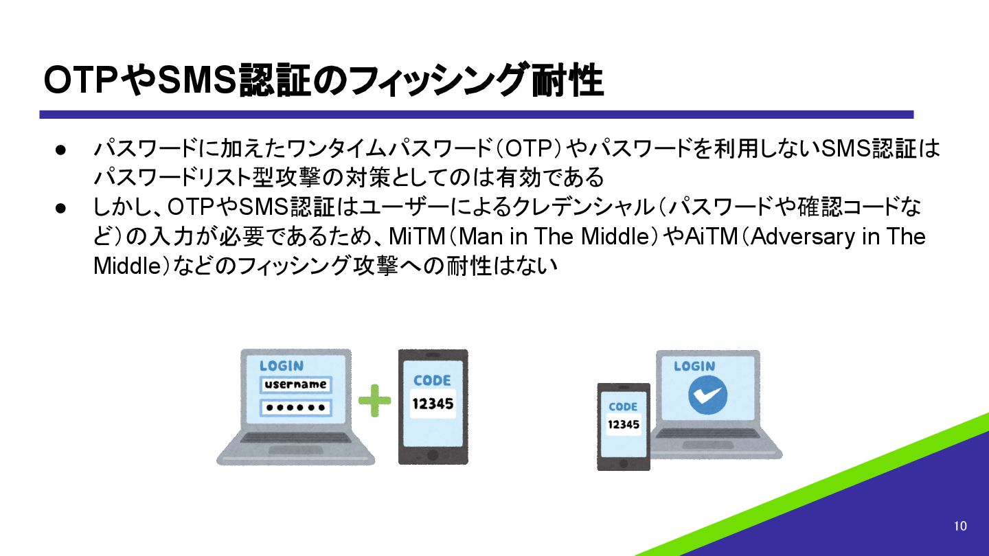 OTPやSMS認証のフィッシング耐性 • パスワードに加えたワンタイムパスワード(OTP)やパスワードを利用しないSMS認証は パスワードリスト型攻撃の対策としてのは有効である • しかし、OTPやSMS認証はユーザーによるクレデンシャル(パスワードや確認コードな ど)の入力が必要であるため、MiTM(Man in The Middle)やAiTM(Adversary