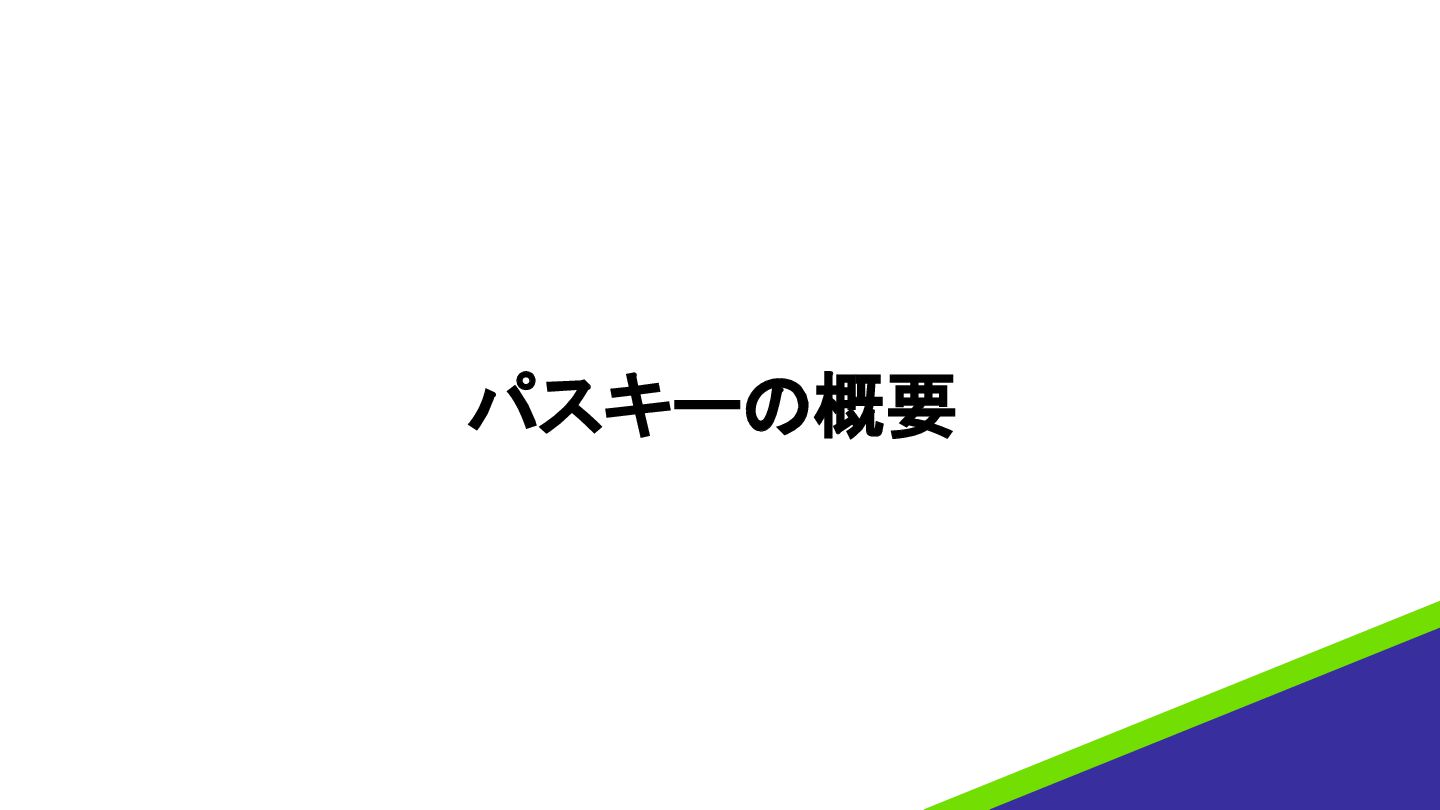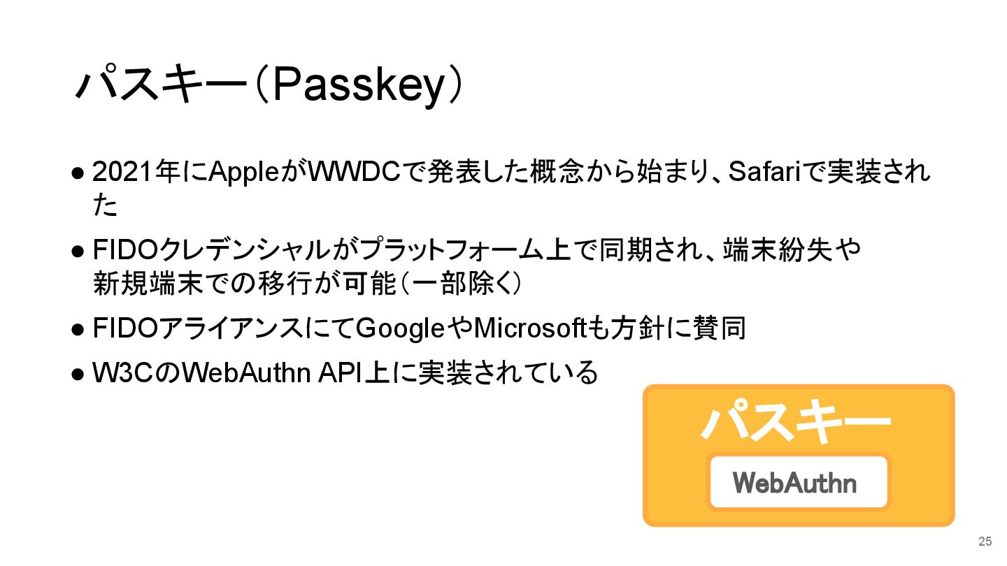 パスキー(Passkey) • 2021年にAppleがWWDCで発表した概念から始まり、Safariで実装され た • FIDOクレデンシャルがプラットフォーム上で同期され、端末紛失や 新規端末での移行が可能(一部除く) • FIDOアライアンスにてGoogleやMicrosoftも方針に賛同 •