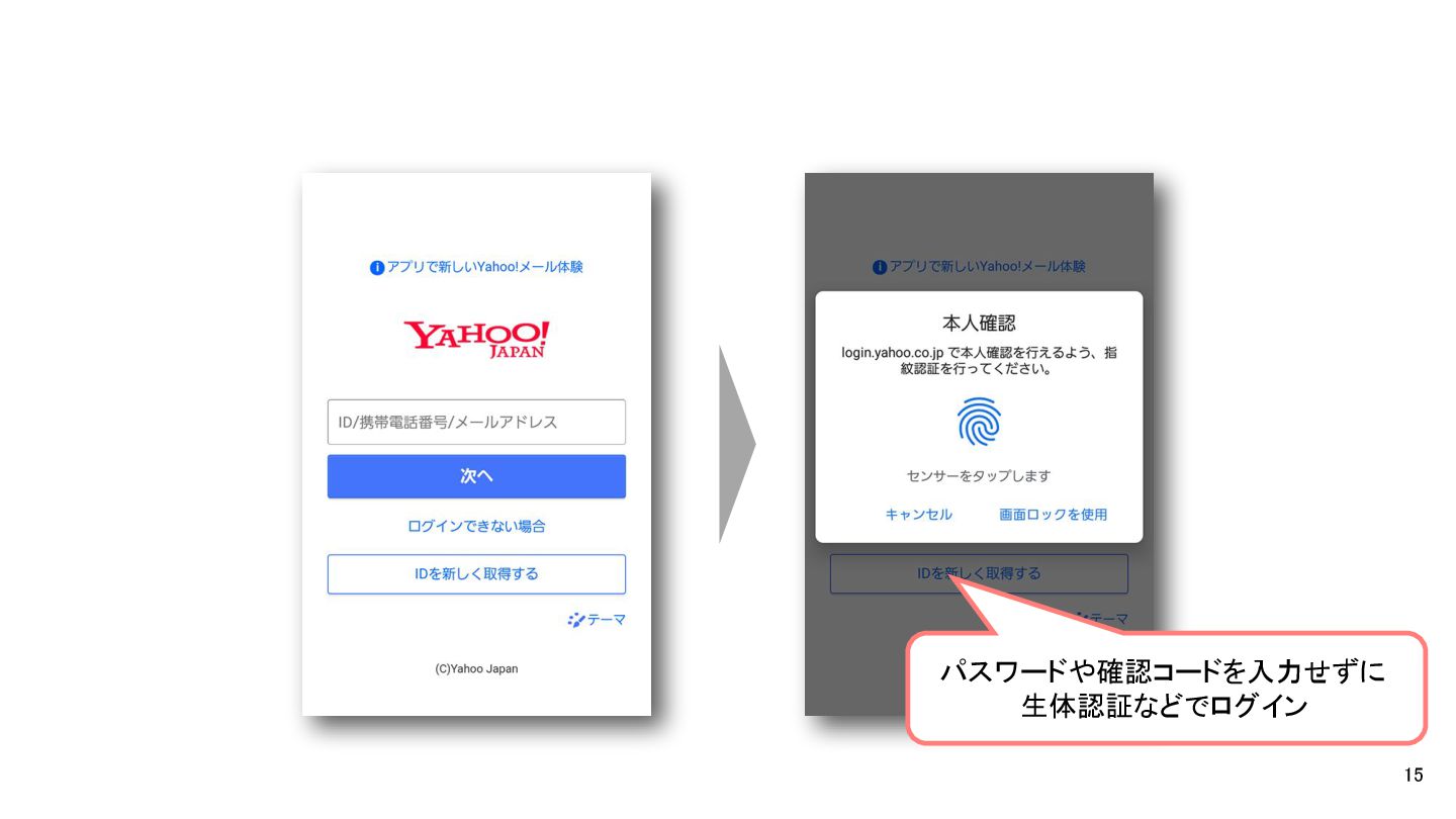パスワードや確認コードを入力せずに 生体認証などでログイン 15