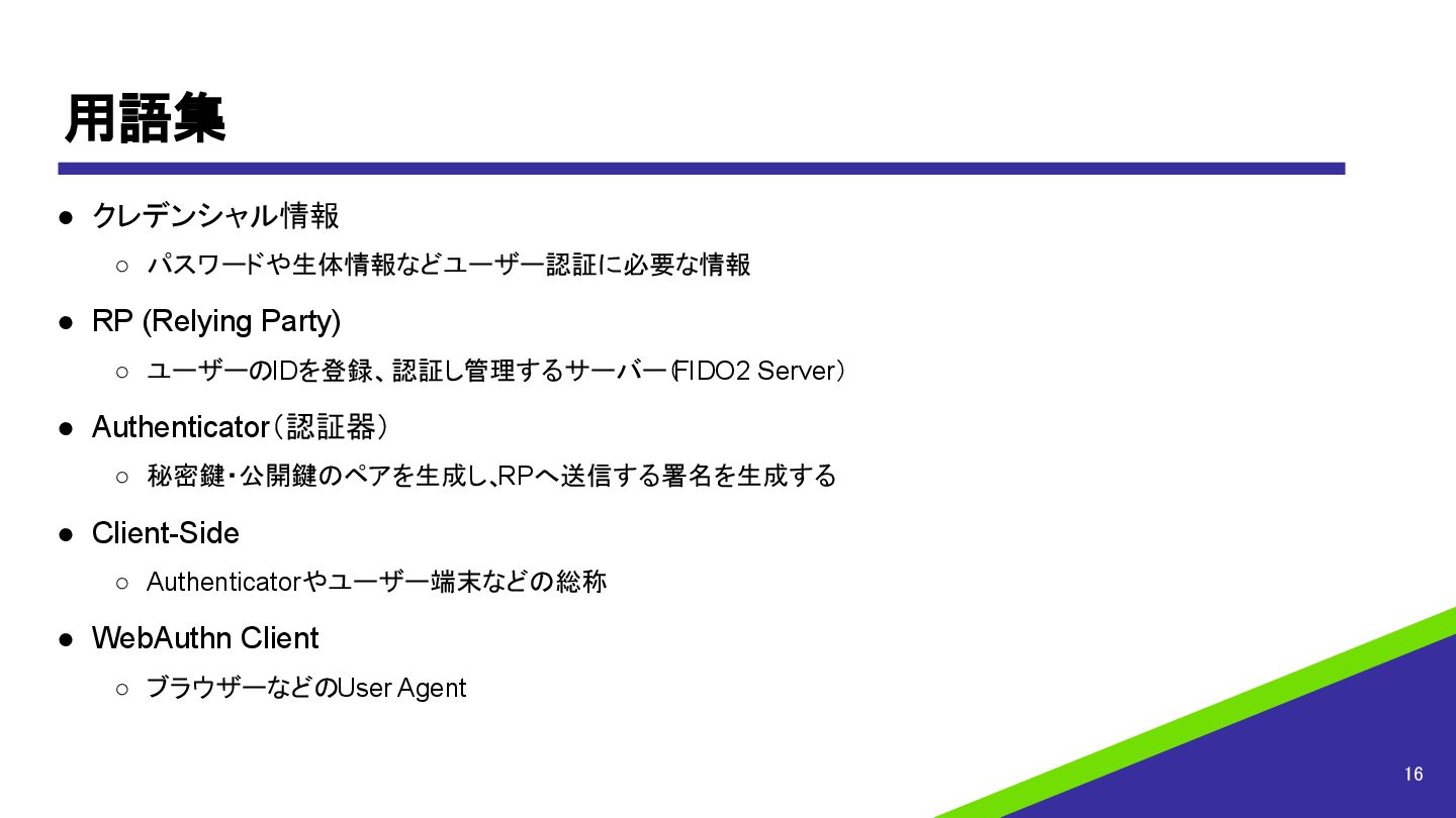 ユーザーのIDを登録、認証し管理するサーバー( FIDO2 Server) • Authenticator(認証器) ◦ 秘密鍵・公開鍵のペアを生成し、 RPへ送信する署名を生成する • Client-Side ◦ Authenticatorやユーザー端末などの総称 • WebAuthn Client ◦ ブラウザーなどのUser Agent 16