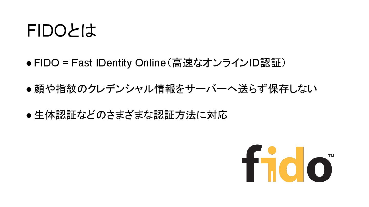 FIDOとは •FIDO = Fast IDentity Online(高速なオンラインID認証) •顔や指紋のクレデンシャル情報をサーバーへ送らず保存しない •生体認証などのさまざまな認証方法に対応