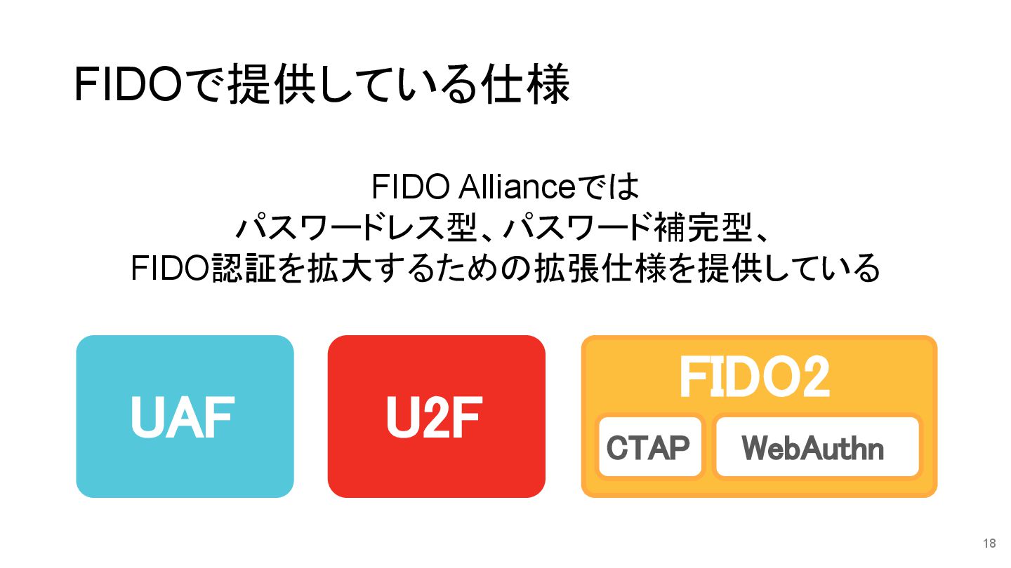 FIDOで提供している仕様 18 UAF U2F FIDO2 CTAP WebAuthn FIDO Allianceでは パスワードレス型、パスワード補完型、
