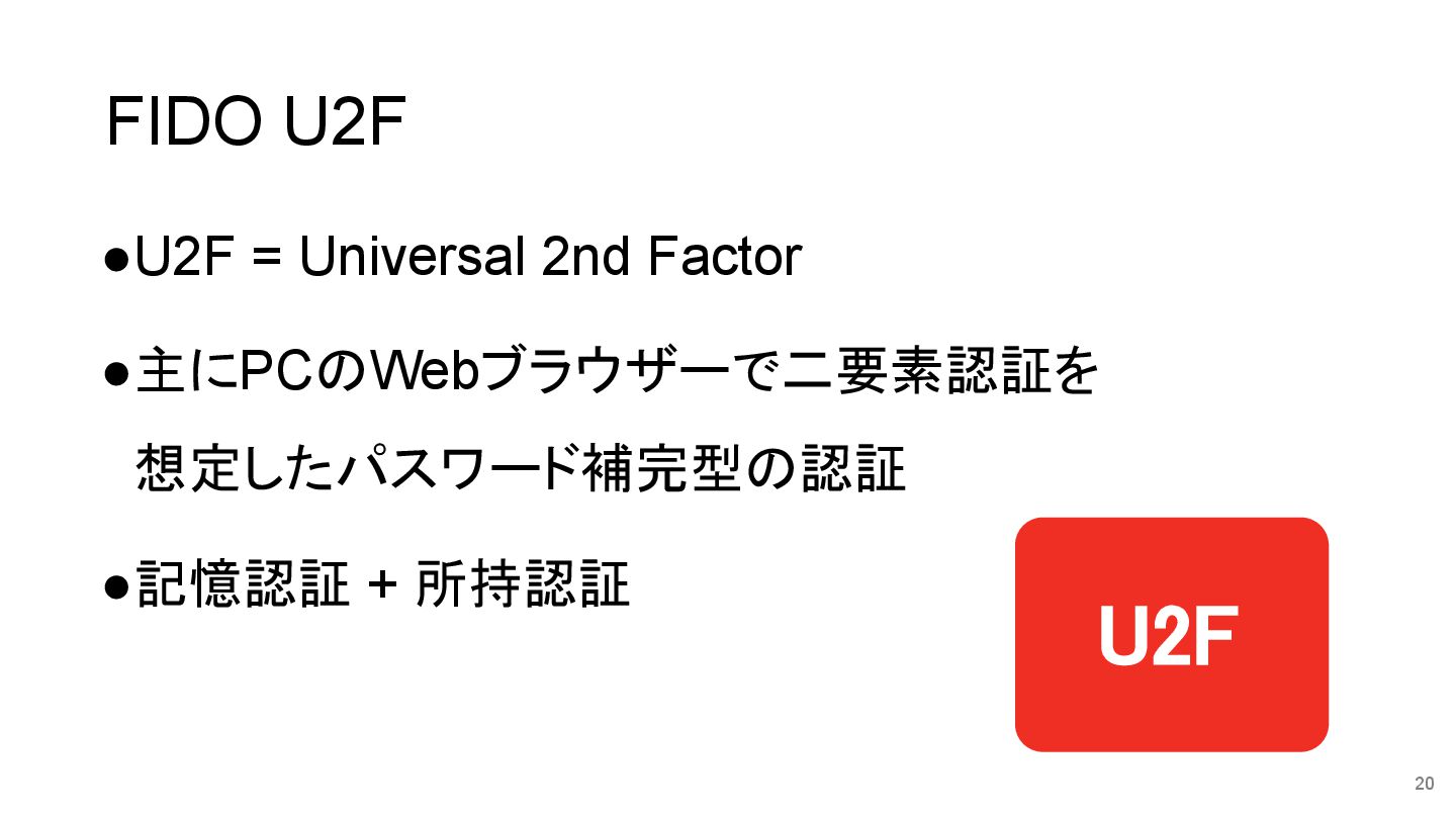 FIDO U2F •U2F = Universal 2nd Factor •主にPCのWebブラウザーで二要素認証を 想定したパスワード補完型の認証 •記憶認証
