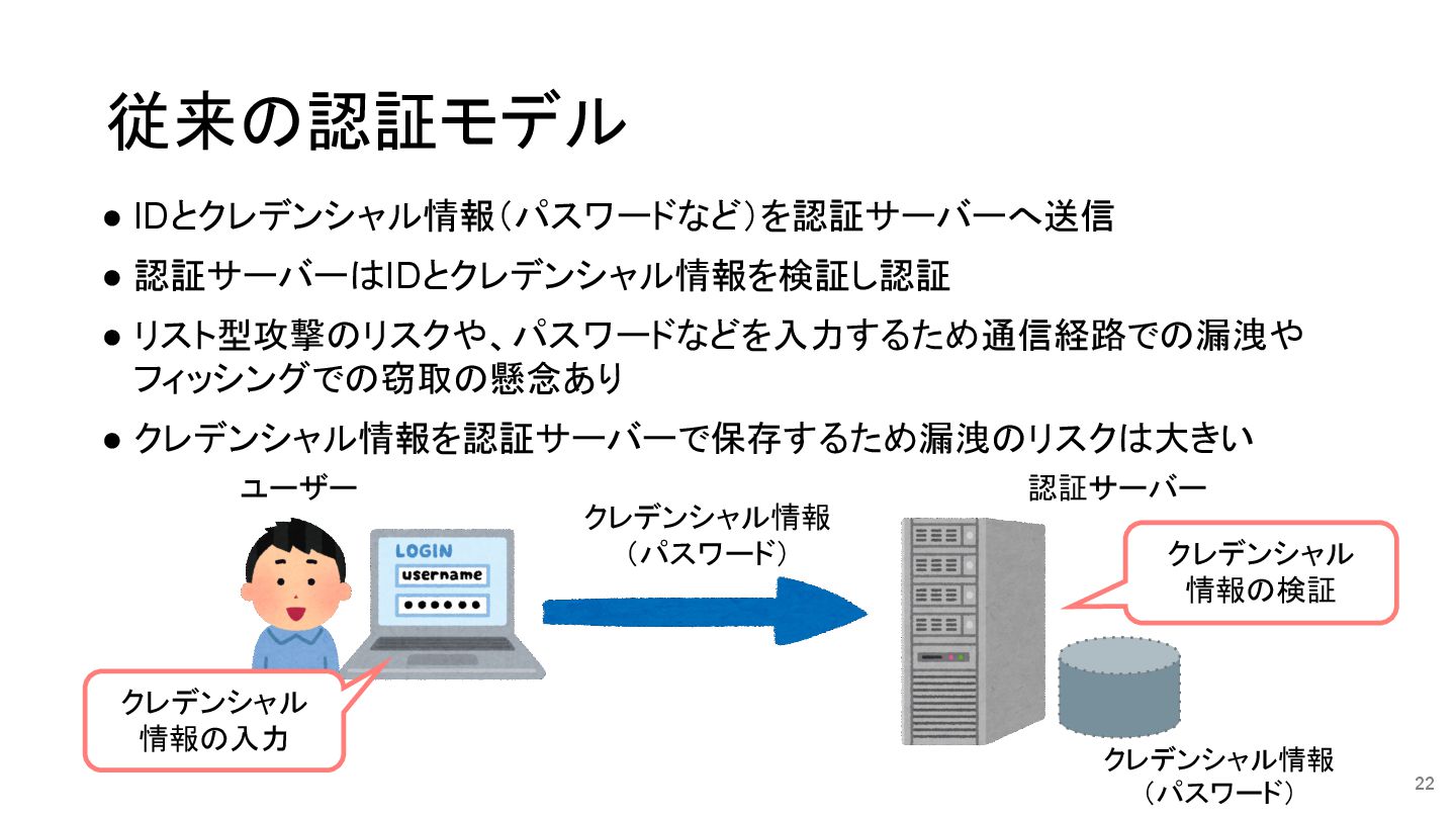 • IDとクレデンシャル情報(パスワードなど)を認証サーバーへ送信 • 認証サーバーはIDとクレデンシャル情報を検証し認証 • リスト型攻撃のリスクや、パスワードなどを入力するため通信経路での漏洩や フィッシングでの窃取の懸念あり • クレデンシャル情報を認証サーバーで保存するため漏洩のリスクは大きい 従来の認証モデル