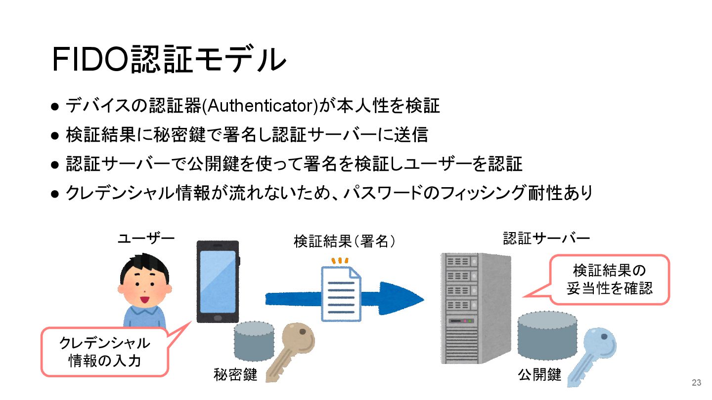 • デバイスの認証器(Authenticator)が本人性を検証 • 検証結果に秘密鍵で署名し認証サーバーに送信 • 認証サーバーで公開鍵を使って署名を検証しユーザーを認証 • クレデンシャル情報が流れないため、パスワードのフィッシング耐性あり FIDO認証モデル 23