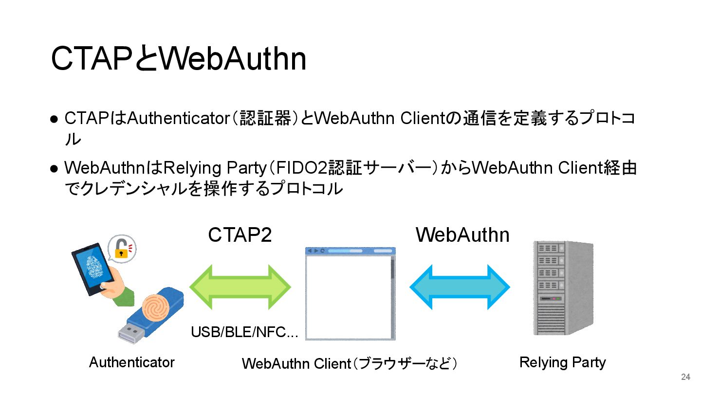 24 CTAP2 WebAuthn Authenticator WebAuthn Client(ブラウザーなど) Relying Party USB/BLE/NFC...