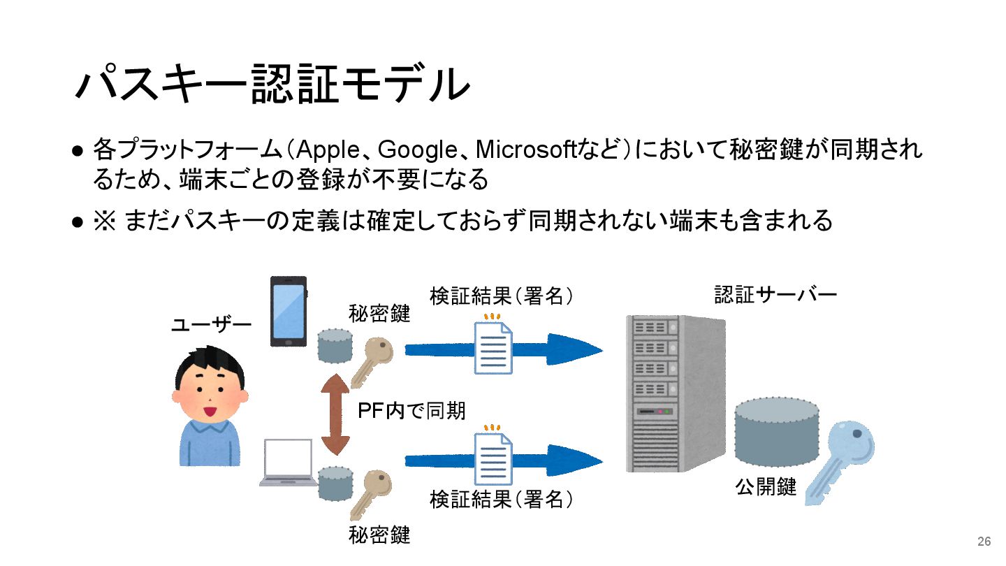 • 各プラットフォーム(Apple、Google、Microsoftなど)において秘密鍵が同期され るため、端末ごとの登録が不要になる • ※ まだパスキーの定義は確定しておらず同期されない端末も含まれる パスキー認証モデル 26 ユーザー 認証サーバー