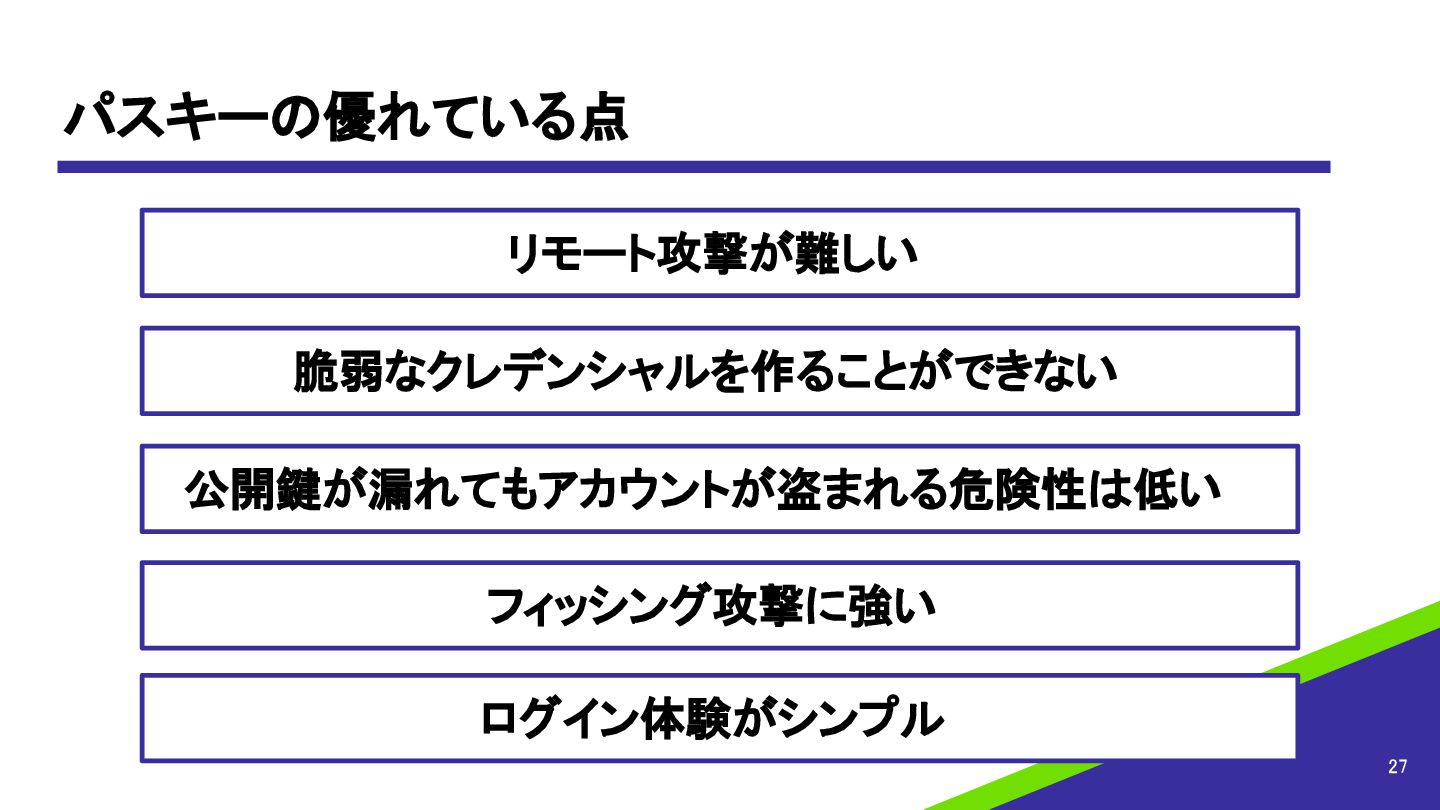 パスキーの優れている点 27 リモート攻撃が難しい 脆弱なクレデンシャルを作ることができない 公開鍵が漏れてもアカウントが盗まれる危険性は低い フィッシング攻撃に強い ログイン体験がシンプル