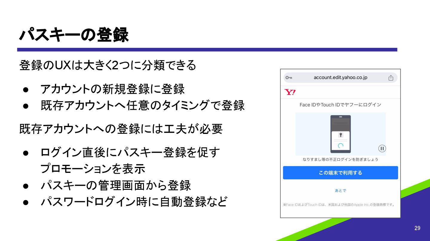 • パスキーの管理画面から登録 • パスワードログイン時に自動登録など 29