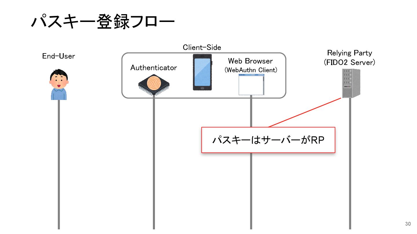 Relying Party (FIDO2 Server) End-User Authenticator Web Browser (WebAuthn Client) Client-Side パスキーによって端末間でも 秘密鍵が同期される(一部を除く) パスキー認証フロー
