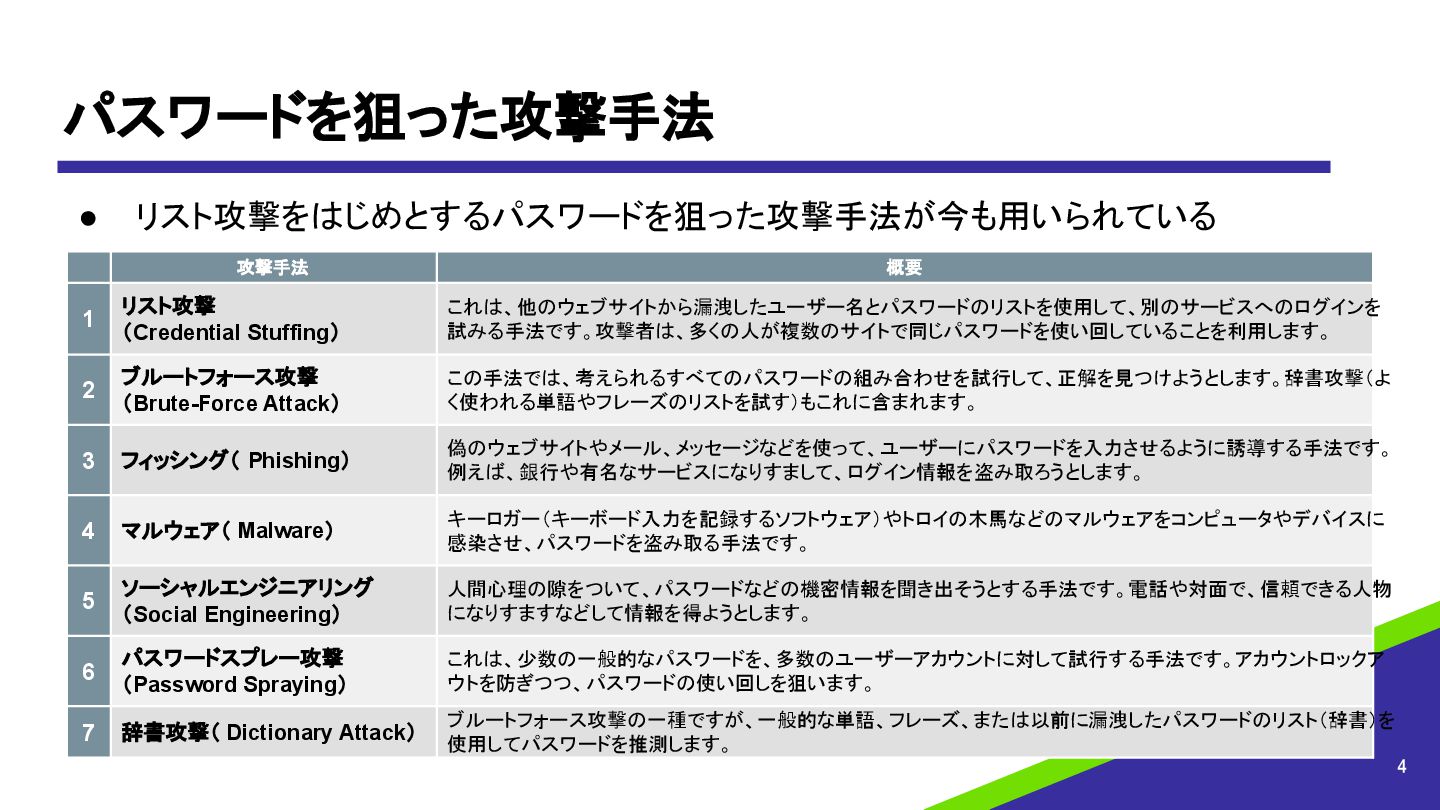 これは、他のウェブサイトから漏洩したユーザー名とパスワードのリストを使用して、別のサービスへのログインを 試みる手法です。攻撃者は、多くの人が複数のサイトで同じパスワードを使い回していることを利用します。 2 ブルートフォース攻撃 (Brute-Force Attack) この手法では、考えられるすべてのパスワードの組み合わせを試行して、正解を見つけようとします。辞書攻撃(よ く使われる単語やフレーズのリストを試す)もこれに含まれます。 3 フィッシング( Phishing) 偽のウェブサイトやメール、メッセージなどを使って、ユーザーにパスワードを入力させるように誘導する手法です。 例えば、銀行や有名なサービスになりすまして、ログイン情報を盗み取ろうとします。 4 マルウェア( Malware) キーロガー(キーボード入力を記録するソフトウェア)やトロイの木馬などのマルウェアをコンピュータやデバイスに 感染させ、パスワードを盗み取る手法です。 5 ソーシャルエンジニアリング (Social Engineering) 人間心理の隙をついて、パスワードなどの機密情報を聞き出そうとする手法です。電話や対面で、信頼できる人物 になりすますなどして情報を得ようとします。 6 パスワードスプレー攻撃 (Password Spraying) これは、少数の一般的なパスワードを、多数のユーザーアカウントに対して試行する手法です。アカウントロックア ウトを防ぎつつ、パスワードの使い回しを狙います。 7 辞書攻撃( Dictionary Attack) ブルートフォース攻撃の一種ですが、一般的な単語、フレーズ、または以前に漏洩したパスワードのリスト(辞書)を 使用してパスワードを推測します。