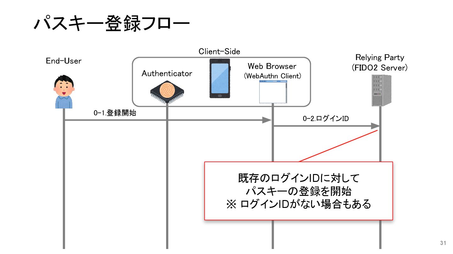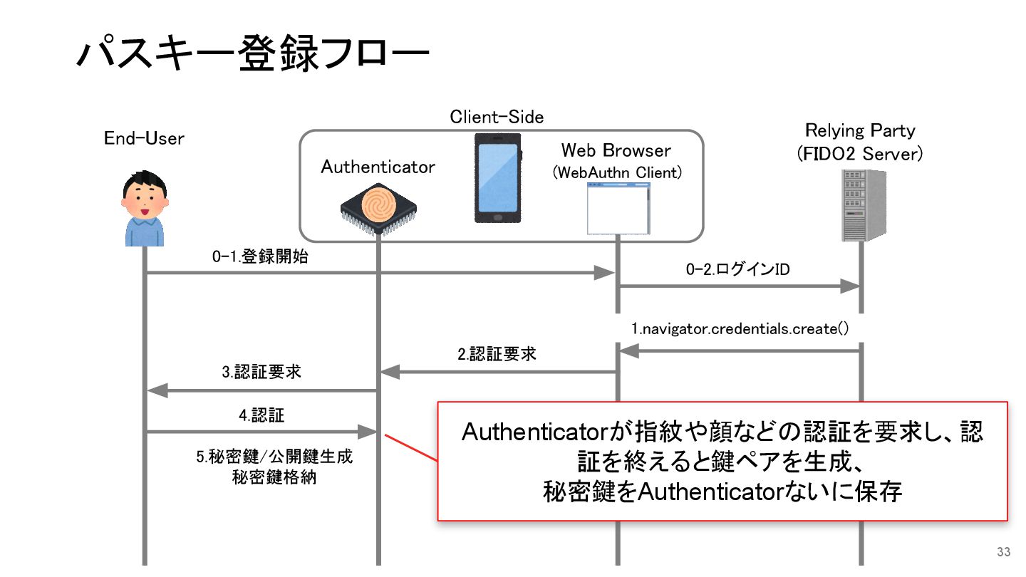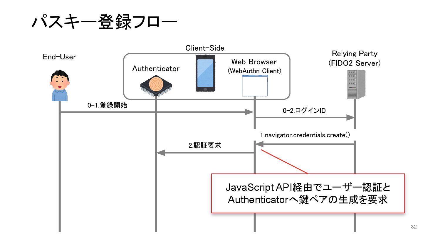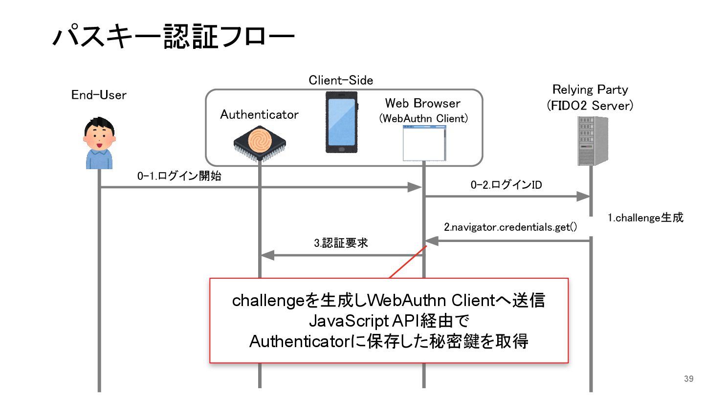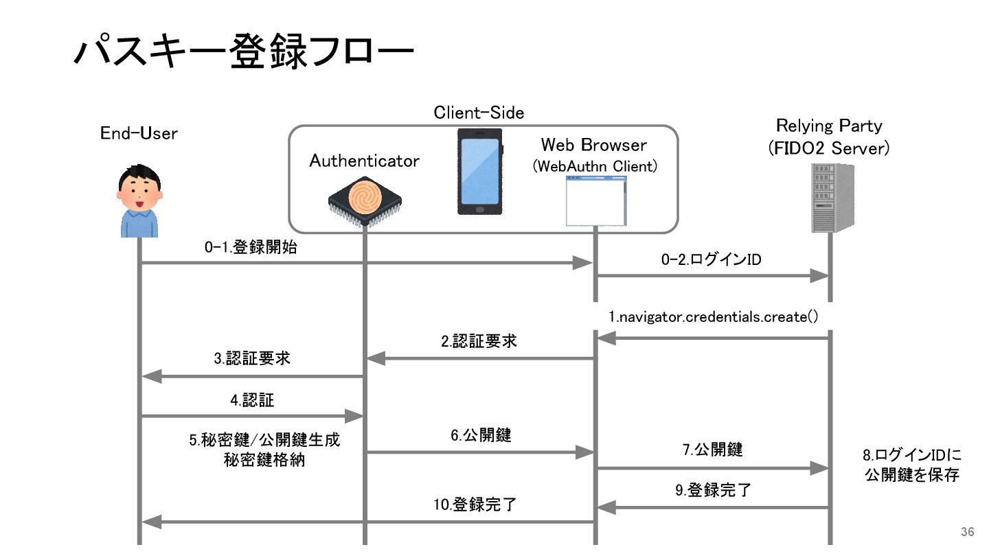 秘密鍵格納 8.ログインIDに 公開鍵を保存 0-1.登録開始 1.navigator.credentials.create() Relying Party (FIDO2 Server) End-User Authenticator Web Browser (WebAuthn Client) Client-Side パスキー登録フロー