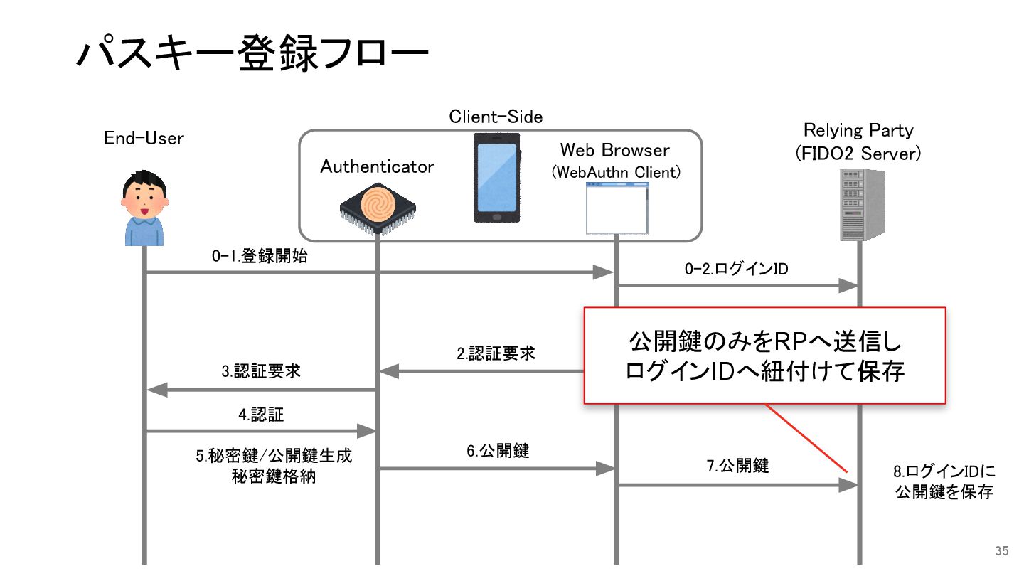 34 0-2.ログインID 3.認証要求 2.認証要求 4.認証 5.秘密鍵/公開鍵生成 秘密鍵格納 0-1.登録開始 1.navigator.credentials.create() Relying