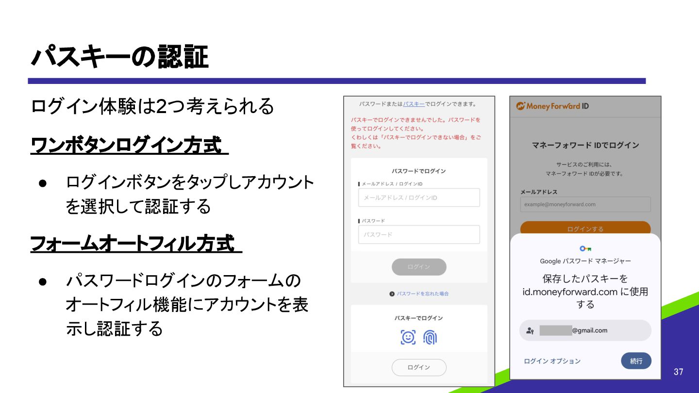 パスキーの認証 ログイン体験は2つ考えられる ワンボタンログイン方式 • ログインボタンをタップしアカウント を選択して認証する フォームオートフィル方式 • パスワードログインのフォームの オートフィル機能にアカウントを表