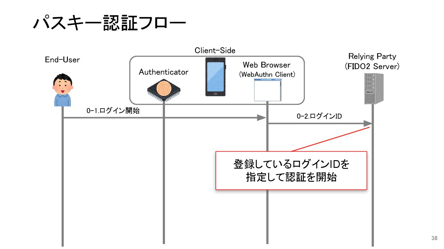 38 0-2.ログインID 0-1.ログイン開始 Relying Party (FIDO2 Server) End-User Authenticator Web