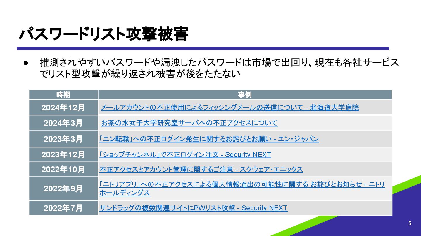 北海道大学病院 2024年3月 お茶の水女子大学研究室サーバへの不正アクセスについて 2023年3月 「エン転職」への不正ログイン発生に関するお詫びとお願い - エン・ジャパン 2023年12月 「ショップチャンネル」で不正ログイン注文 - Security NEXT 2022年10月 不正アクセスとアカウント管理に関するご注意 - スクウェア・エニックス 2022年9月 「ニトリアプリ」への不正アクセスによる個人情報流出の可能性に関する お詫びとお知らせ - ニトリ ホールディングス 2022年7月 サンドラッグの複数関連サイトにPWリスト攻撃 - Security NEXT