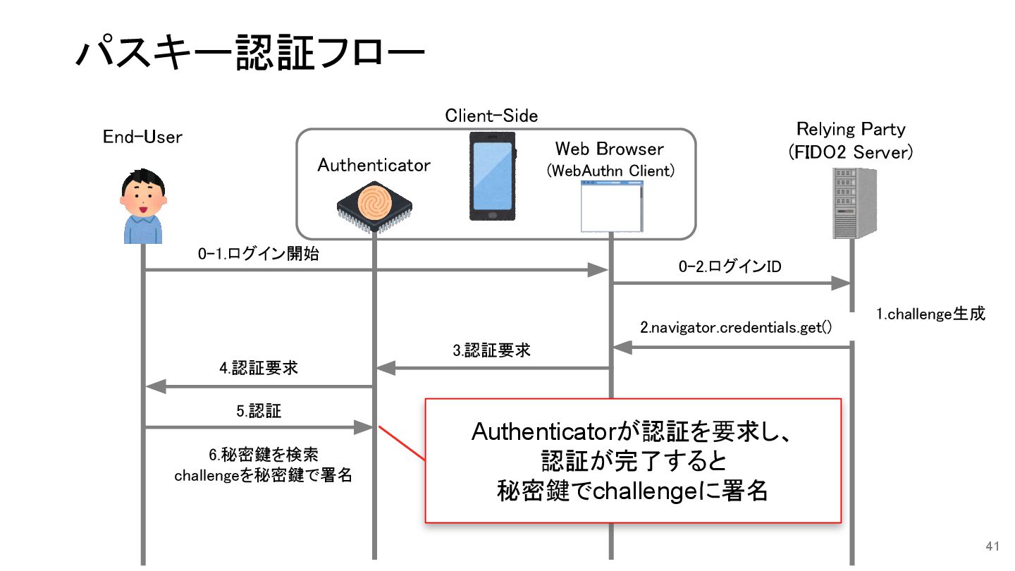 6.秘密鍵を検索 challengeを秘密鍵で署名 40 0-2.ログインID 4.認証要求 3.認証要求 5.認証 2.navigator.credentials.get() 1.challenge生成 0-1.ログイン開始