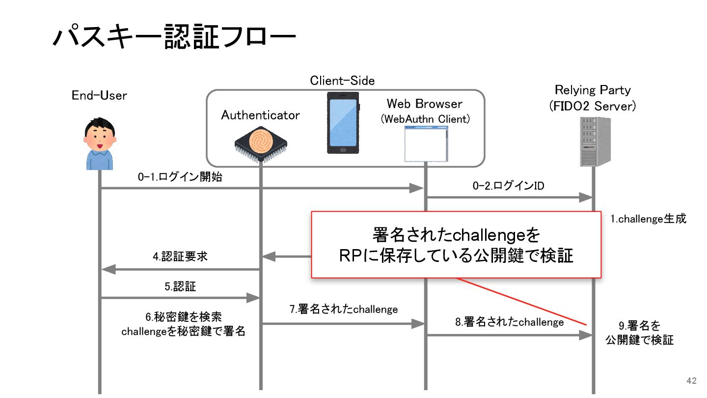 6.秘密鍵を検索 challengeを秘密鍵で署名 41 0-2.ログインID 4.認証要求 3.認証要求 5.認証 2.navigator.credentials.get() 1.challenge生成 0-1.ログイン開始