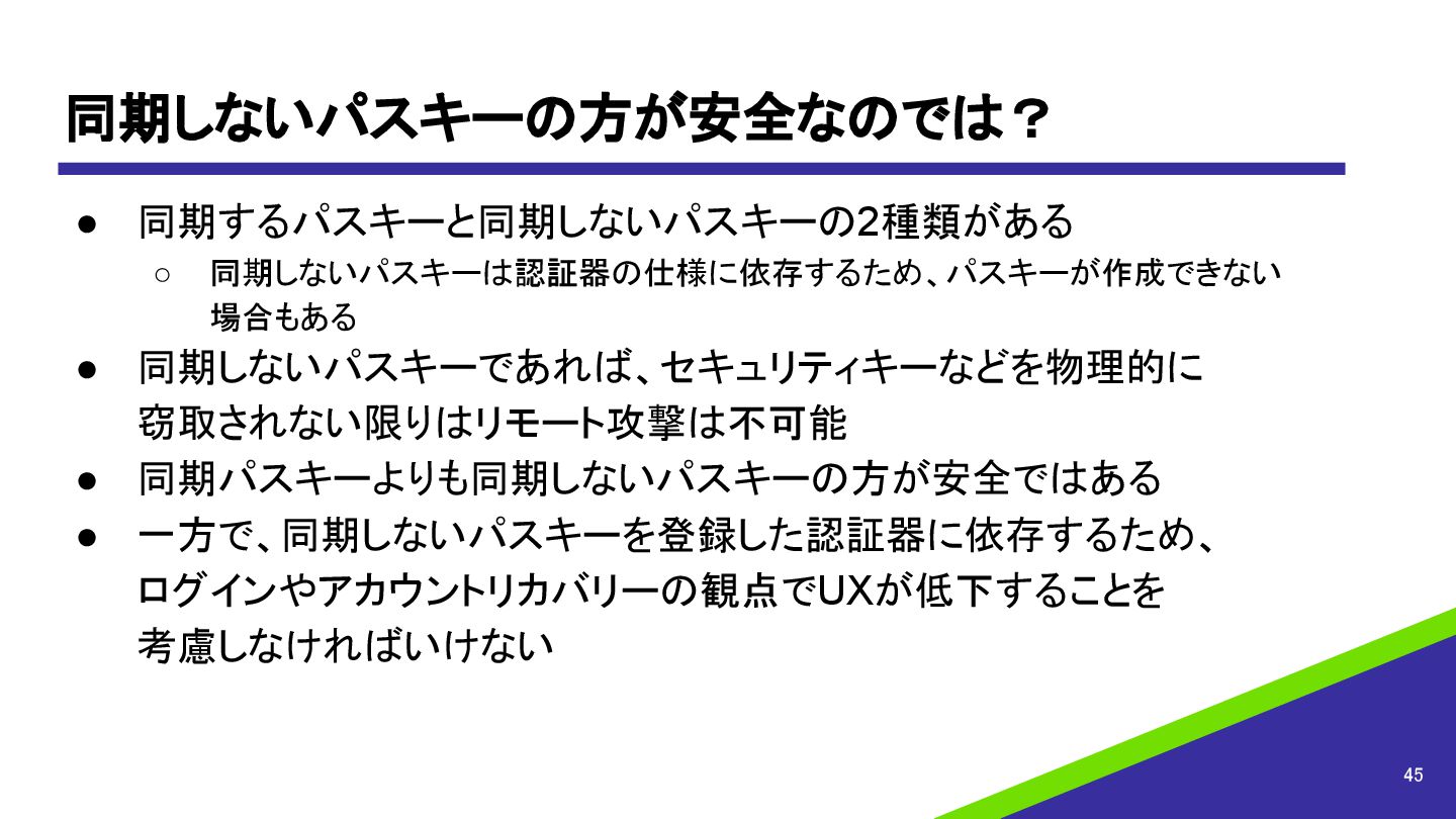 同期パスキーよりも同期しないパスキーの方が安全ではある • 一方で、同期しないパスキーを登録した認証器に依存するため、 ログインやアカウントリカバリーの観点でUXが低下することを 考慮しなければいけない 45
