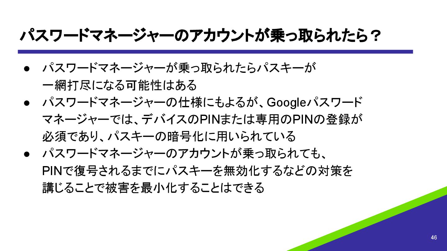 パスワードマネージャーのアカウントが乗っ取られたら? • パスワードマネージャーが乗っ取られたらパスキーが 一網打尽になる可能性はある • パスワードマネージャーの仕様にもよるが、Googleパスワード マネージャーでは、デバイスのPINまたは専用のPINの登録が 必須であり、パスキーの暗号化に用いられている • パスワードマネージャーのアカウントが乗っ取られても、