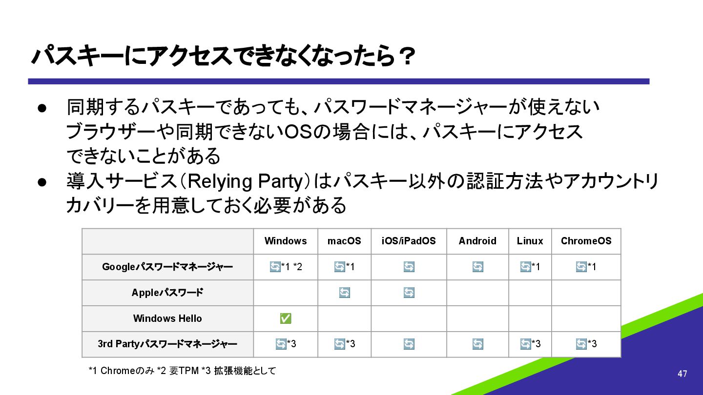 パスキーにアクセスできなくなったら? • 同期するパスキーであっても、パスワードマネージャーが使えない ブラウザーや同期できないOSの場合には、パスキーにアクセス できないことがある • 導入サービス(Relying Party)はパスキー以外の認証方法やアカウントリ カバリーを用意しておく必要がある 47