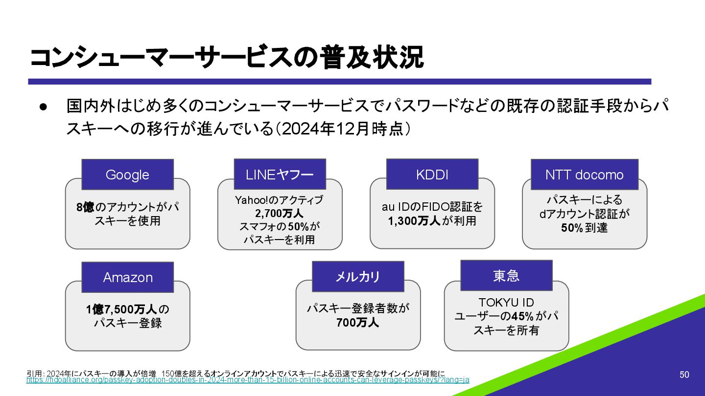 50%到達 1億7,500万人の パスキー登録 8億のアカウントがパ スキーを使用 TOKYU ID ユーザーの45%がパ スキーを所有 au IDのFIDO認証を 1,300万人が利用 Yahoo!のアクティブ 2,700万人 スマフォの50%が パスキーを利用 パスキー登録者数が 700万人 Amazon Google KDDI NTT docomo メルカリ 東急 LINEヤフー