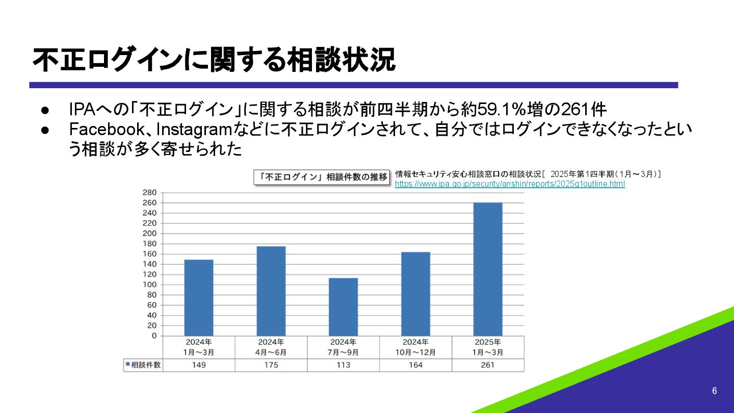 不正ログインに関する相談状況 • IPAへの「不正ログイン」に関する相談が前四半期から約59.1%増の261件 • Facebook、Instagramなどに不正ログインされて、自分ではログインできなくなったとい う相談が多く寄せられた 6 情報セキュリティ安心相談窓口の相談状況[ 2025年第1四半期(1月~3月)] https://www.ipa.go.jp/security/anshin/reports/2025q1outline.html