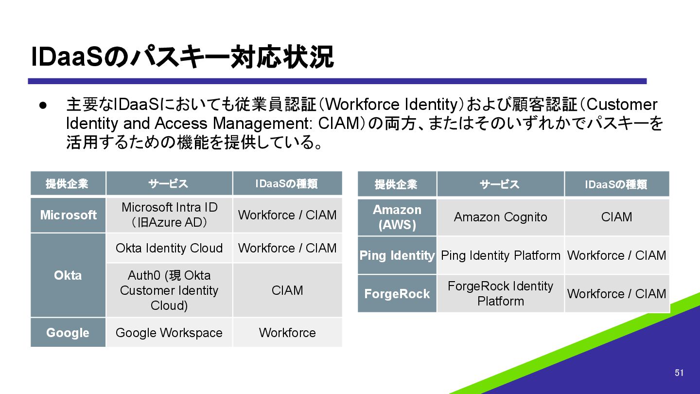 IDaaSのパスキー対応状況 51 • 主要なIDaaSにおいても従業員認証(Workforce Identity)および顧客認証(Customer Identity and Access Management: CIAM)の両方、またはそのいずれかでパスキーを