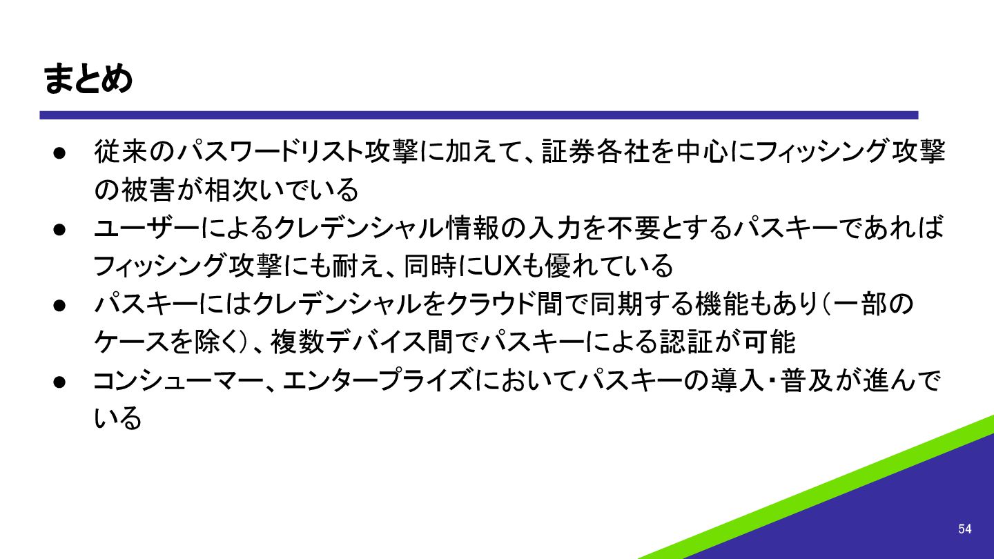 まとめ • 従来のパスワードリスト攻撃に加えて、証券各社を中心にフィッシング攻撃 の被害が相次いでいる • ユーザーによるクレデンシャル情報の入力を不要とするパスキーであれば フィッシング攻撃にも耐え、同時にUXも優れている • パスキーにはクレデンシャルをクラウド間で同期する機能もあり(一部の ケースを除く)、複数デバイス間でパスキーによる認証が可能