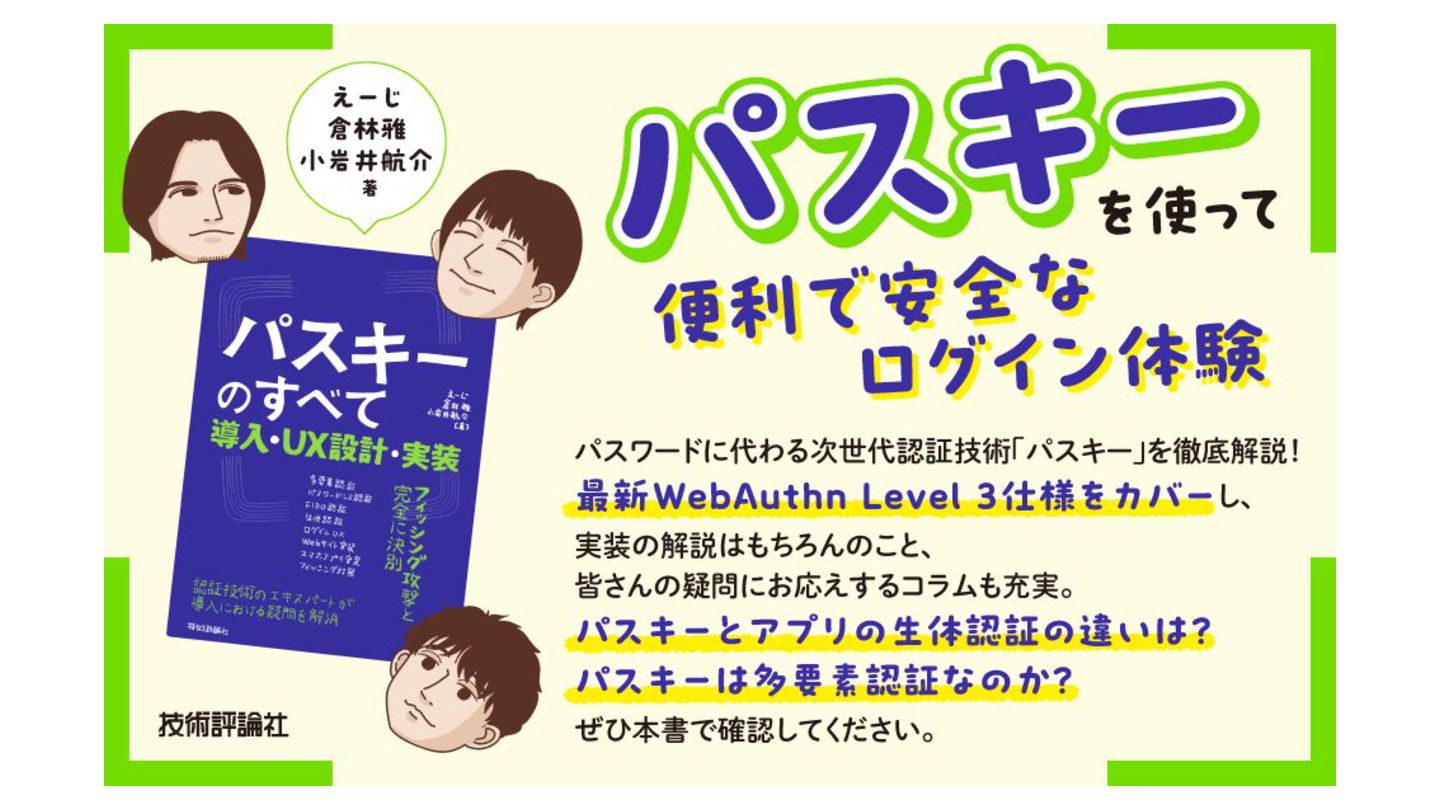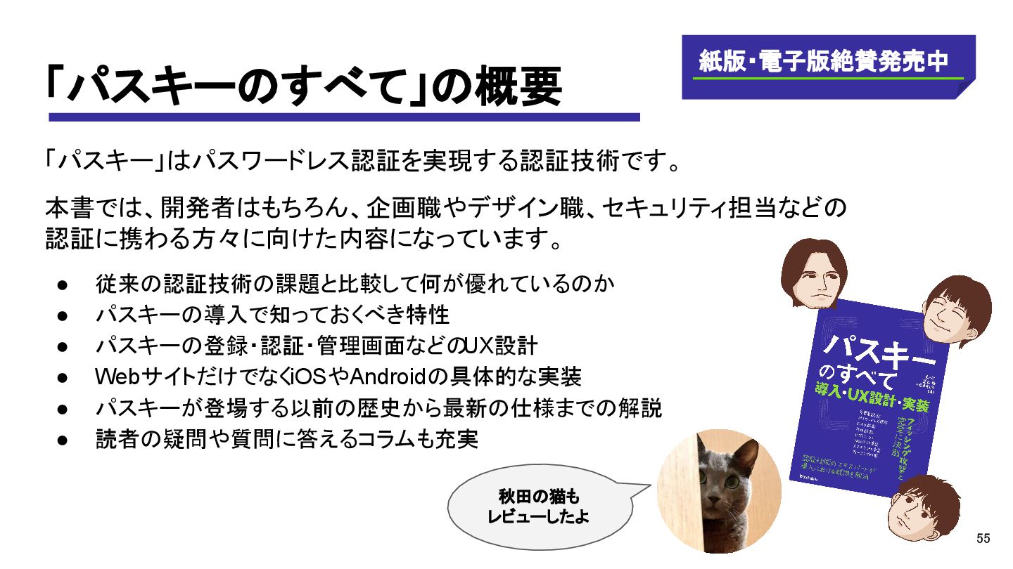 パスキーの登録・認証・管理画面などの UX設計 • WebサイトだけでなくiOSやAndroidの具体的な実装 • パスキーが登場する以前の歴史から最新の仕様までの解説 • 読者の疑問や質問に答えるコラムも充実 紙版・電子版絶賛発売中 秋田の猫も レビューしたよ