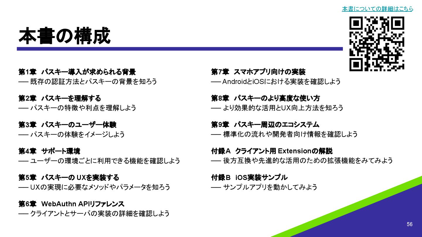 55 「パスキーのすべて」の概要 「パスキー」はパスワードレス認証を実現する認証技術です。 本書では、開発者はもちろん、企画職やデザイン職、セキュリティ担当などの 認証に携わる方々に向けた内容になっています。 • 従来の認証技術の課題と比較して何が優れているのか • パスキーの導入で知っておくべき特性 •