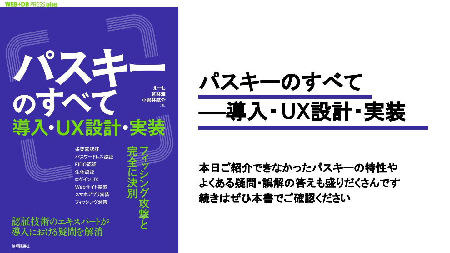パスキーのすべて ──導入・UX設計・実装 本日ご紹介できなかったパスキーの特性や よくある疑問・誤解の答えも盛りだくさんです 続きはぜひ本書でご確認ください
