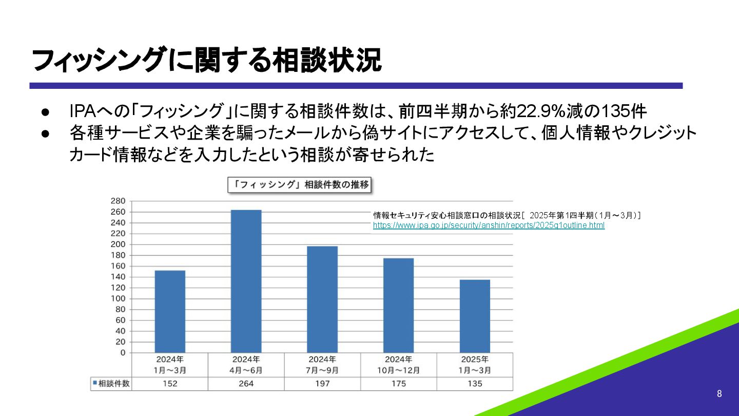 フィッシングに関する相談状況 • IPAへの「フィッシング」に関する相談件数は、前四半期から約22.9%減の135件 • 各種サービスや企業を騙ったメールから偽サイトにアクセスして、個人情報やクレジット カード情報などを入力したという相談が寄せられた 8 情報セキュリティ安心相談窓口の相談状況[ 2025年第1四半期(1月~3月)] https://www.ipa.go.jp/security/anshin/reports/2025q1outline.html