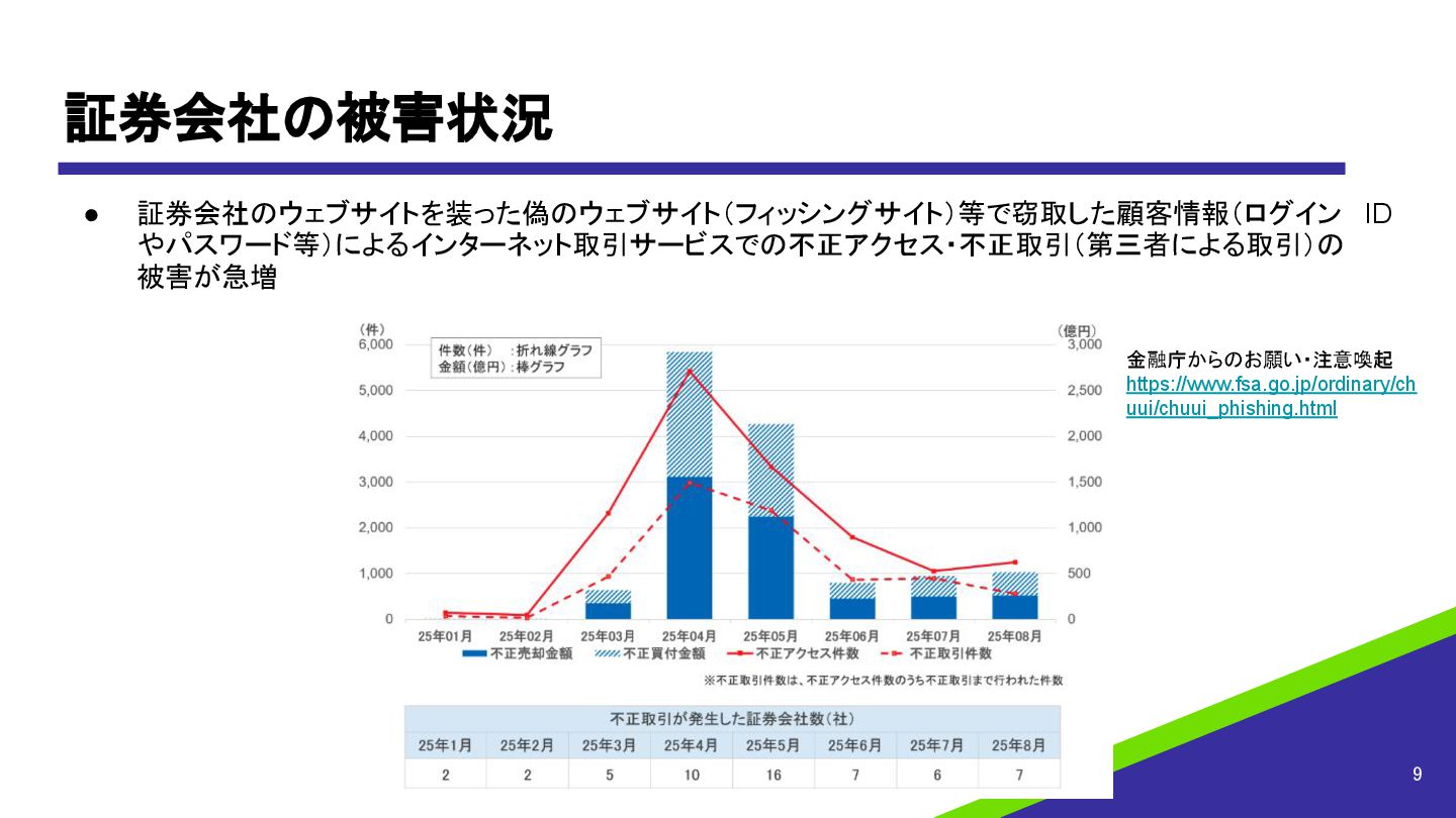 フィッシング攻撃被害 • 金融系をはじめユーザーを偽サイトへ誘導してパスワードなどのクレデンシャルを盗み出す • フィッシング攻撃の被害も継続している 7 時期 事例 2025年08月06日 SMBC日興証券をかたるフィッシング