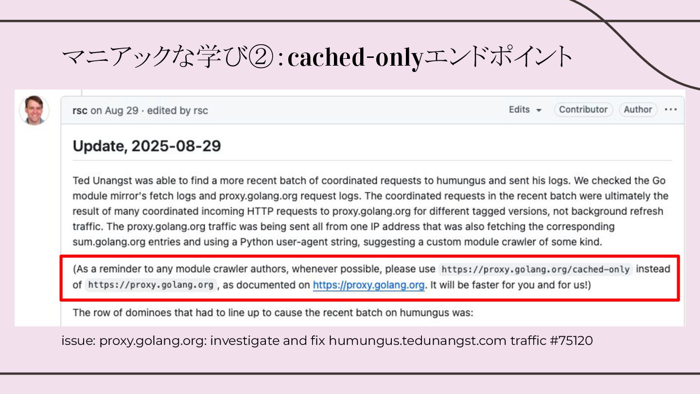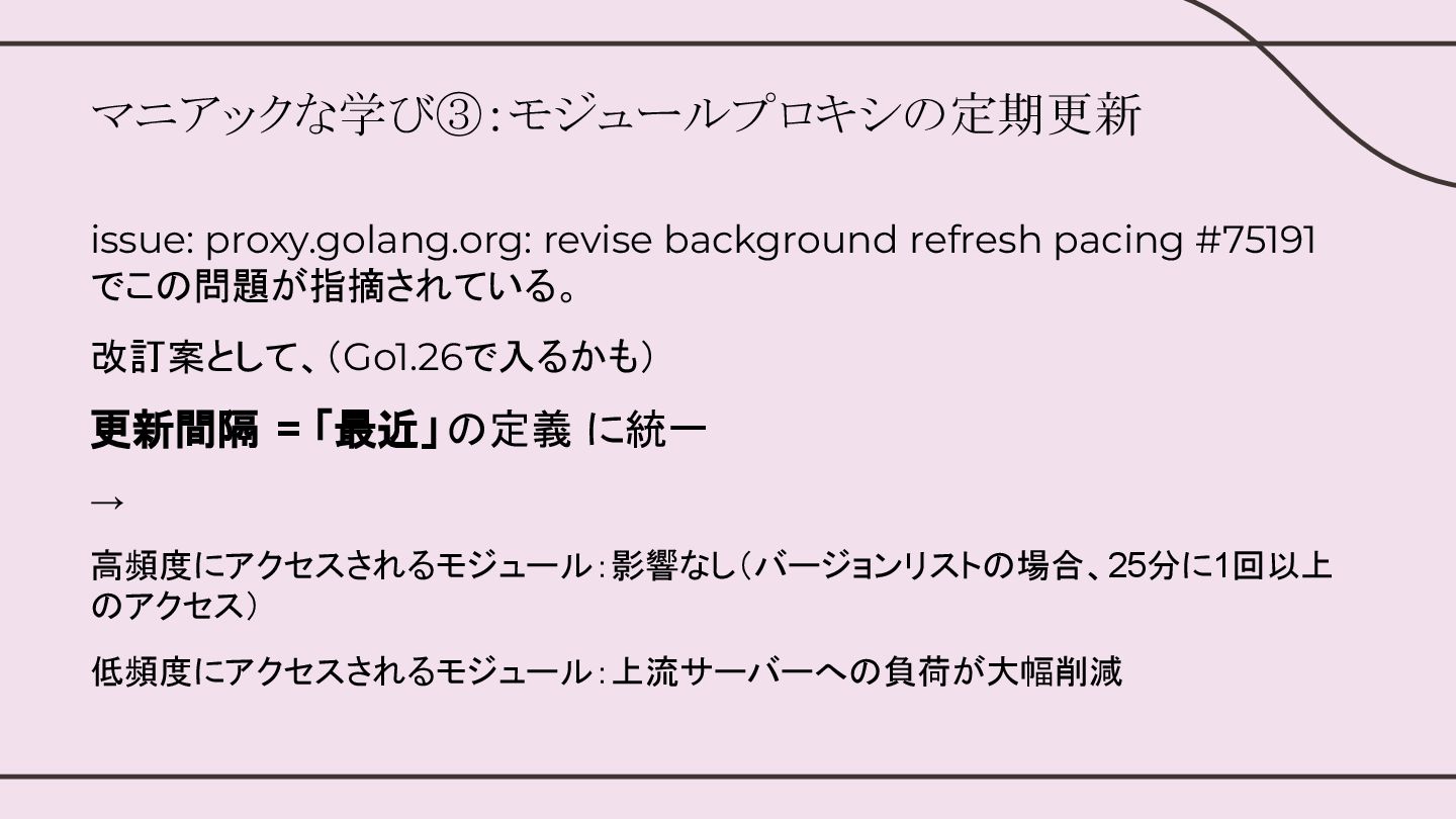8. マニアックな学び③:モジュールプロキシの定期更新 issue: proxy.golang.org: revise background refresh pacing #75191 でこの問題が指摘されている。 改訂案として、(Go1.26で入るかも)