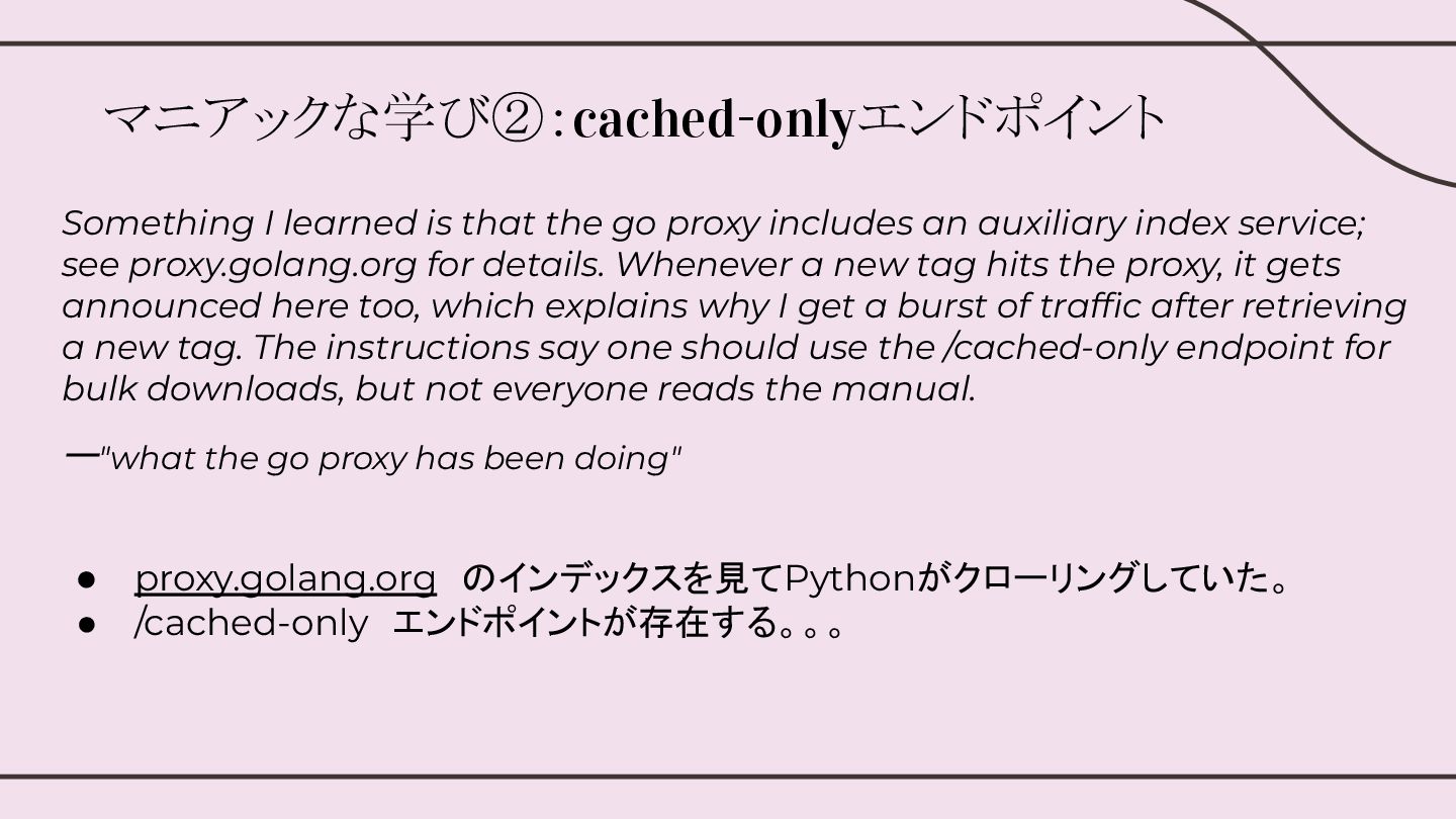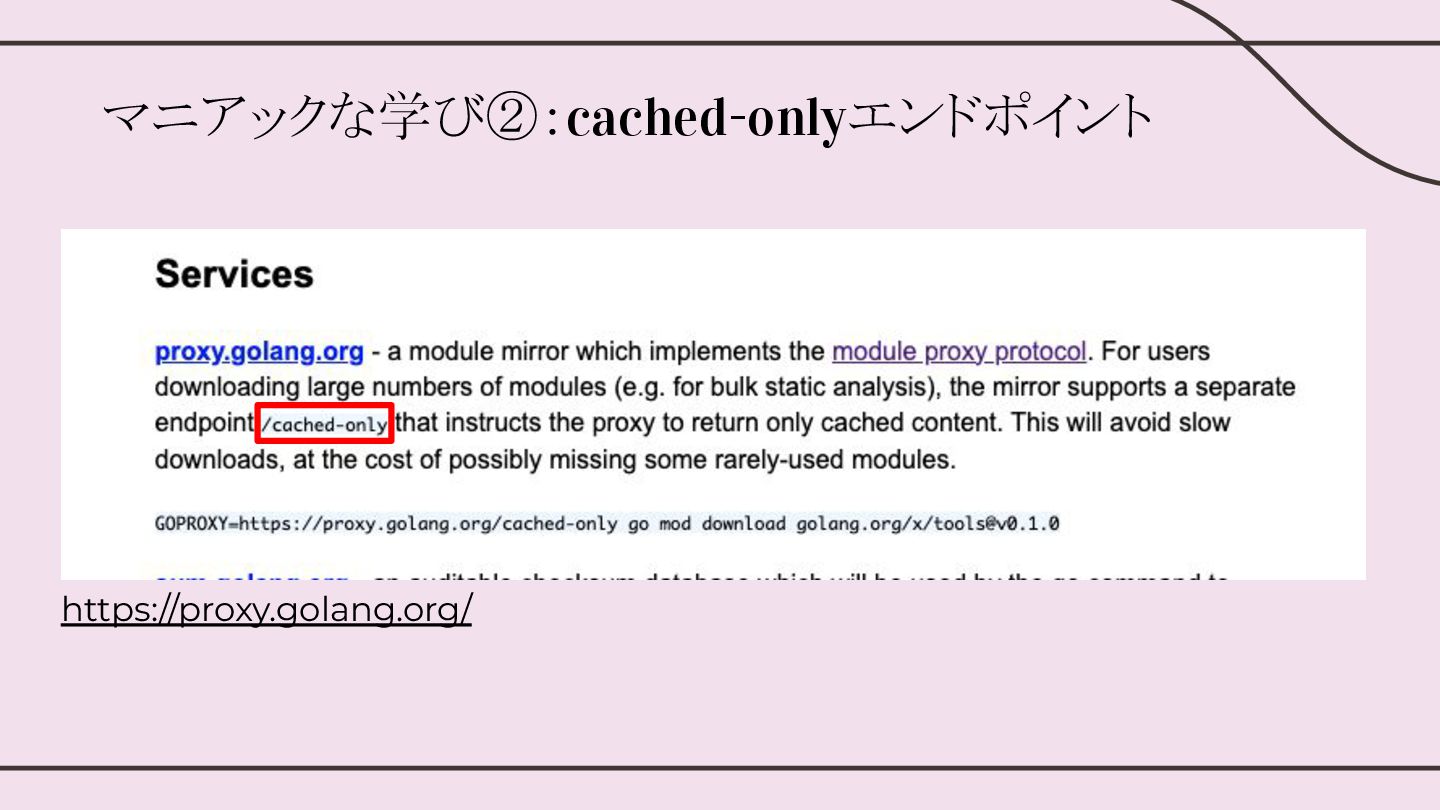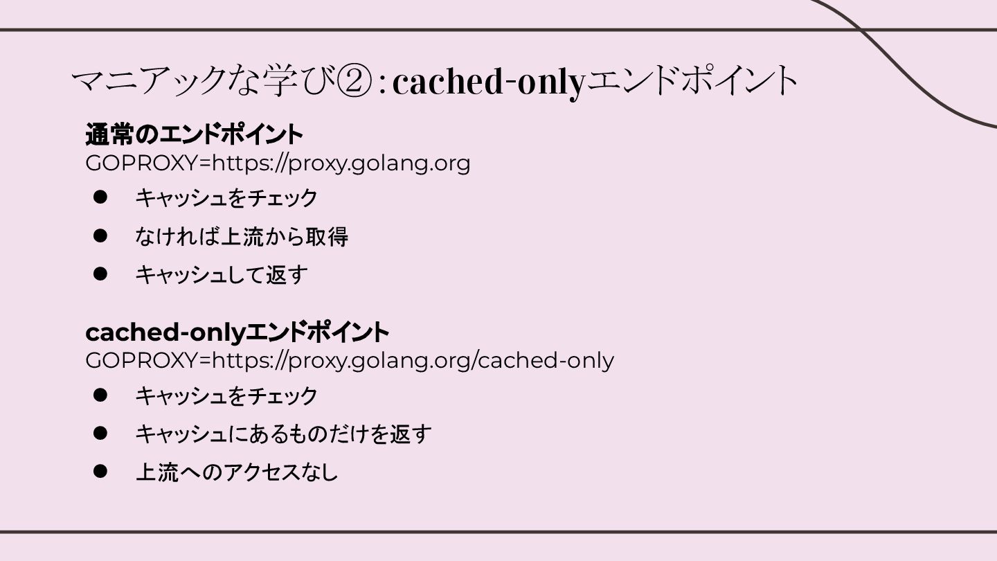 6. マニアックな学び②:cached-onlyエンドポイント Something I learned is that the go proxy includes